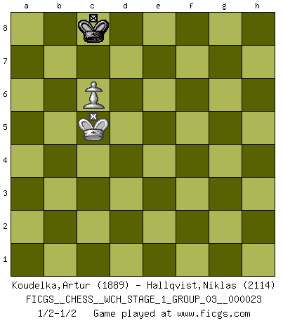 Last move : 1/2-1/2 2021 May 14 22:30:32 [Event "FICGS__CHESS__WCH_STAGE_1_GROUP_03__000023"] [Site "FICGS"] [Date "2020.11.05"] [Round "1"] [White "Koudelka,Artur"] [Black "Hallqvist,Niklas"] [Result "1/2-1/2"] [WhiteElo "1889"] [BlackElo "2114"] 1.e4 e6 2.d4 d5 3.Nc3 Bb4 4.e5 c5 5.a3 Bxc3+ 6.bxc3 Ne7 7.Qg4 Qc7 8.Qxg7 Rg8 9.Qxh7 cxd4 10.Ne2 Nbc6 11.f4 dxc3 12.Qd3 d4 13.Nxd4 Nxd4 14.Qxd4 Bd7 15.Rg1 Nf5 16.Qf2 Qc6 17.Bd3 Qd5 18.Be3 Nxe3 19.Qxe3 Rxg2 20.Rxg2 Qxg2 21.Be4 Qxh2 22.O-O-O Bc6 23.Kb1 Bxe4 24.Qxe4 Qf2 25.Qxb7 Qb6+ 26.Qxb6 axb6 27.Ka2 Ra4 28.Rd6 Rxf4 29.Rxb6 Kd7 30.Kb3 Rf5 31.Rb5 f6 32.a4 fxe5 33.Kxc3 Kc6 34.Rb4 Rf7 35.Rb1 Ra7 36.Ra1 Kc5 37.Kd3 Ra5 38.c3 Kd5 39.Ra2 e4+ 40.Ke3 Ke5 41.Ra3 Kd5 42.Kf4 Ra6 43.a5 e3 44.Kxe3 Kc4 45.Ke4 e5 46.Kxe5 Kc5 47.Ke4 Kc4 48.Ke3 Re6+ 49.Kd2 Ra6 50.Kc1 Kb5 51.Kb2 Rxa5 52.Rxa5+ Kxa5 53.Kb3 Kb5 54.c4+ Kc6 55.Kb4 Kb6 56.c5+ Kc7 57.Kb5 Kb7 58.c6+ Kc8 59.Kb6 Kb8 60.Kc5 Kc7 61.Kd5 Kc8 62.Kc5 1/2-1/2 French : Winawer, Advance, poisoned pawn variation Queenside Castling by player White (move 22) 10 pieces endgame at move 29 : White KRPPP , Black KRPPP WHITE : King + 1 Rook 3 Pawns BLACK : King + 1 Rook 3 Pawns 9 pieces endgame at move 32 : White KRPP , Black KRPPP WHITE : King + 1 Rook 2 Pawns BLACK : King + 1 Rook 3 Pawns 8 pieces endgame at move 33 : White KRPP , Black KRPP WHITE : King + 1 Rook 2 Pawns BLACK : King + 1 Rook 2 Pawns 7 pieces endgame at move 44 : White KRPP , Black KRP WHITE : King + 1 Rook 2 Pawns BLACK : King + 1 Rook 1 Pawn 6 pieces endgame at move 46 : White KRPP , Black KR WHITE : King + 1 Rook 2 Pawns BLACK : King + 1 Rook 5 pieces endgame at move 51 : White KRP , Black KR WHITE : King + 1 Rook 1 Pawn BLACK : King + 1 Rook 4 pieces endgame at move 52 : White KRP , Black K WHITE : King + 1 Rook 1 Pawn BLACK : King + 3 pieces endgame at move 52 : White KP , Black K WHITE : King + 1 Pawn BLACK : King + This chess game ended in a draw. Follow this game move after move (download)I guess a certain amount of temperament is expected of Chess geniuses. (Ron Gross) Schach verlangt totale Konzentration. (Robert James Fischer) En el Ajedrez, tal como es jugado por los Maestros, practicamente la suerte es eliminada. (Emanuel Lasker) Le jeu d'échecs fait naître et fortifie en nous plusieurs qualités précieuses dans le cours de l'existence, telles que la prévoyance, la circonspection, la prudence, et la persévérance. (Benjamin Franklin - 1783, la morale des échecs) Over-the-board chess is the favorite of mortals, correspondence chess is the favorite of the gods. (Eduard Dyckhoff)