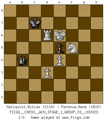 Last move : 1-0 2021 July 19 11:39:18 [Event "FICGS__CHESS__WCH_STAGE_1_GROUP_03__000023"] [Site "FICGS"] [Date "2020.11.05"] [Round "1"] [White "Hallqvist,Niklas"] [Black "Pechova,Hana"] [Result "1-0"] [WhiteElo "2114"] [BlackElo "1810"] 1.c4 e5 2.g3 Nf6 3.Bg2 d5 4.cxd5 Nxd5 5.Nc3 Nb6 6.Nf3 Nc6 7.O-O Be7 8.d3 O-O 9.Rb1 a5 10.Be3 Be6 11.a3 f5 12.b4 axb4 13.axb4 Bf6 14.Ne1 Rf7 15.Bd2 Rd7 16.b5 Na5 17.Bh3 Qe8 18.e4 g6 19.Qf3 f4 20.Bxe6+ Qxe6 21.Qd1 g5 22.Qc2 h6 23.Kh1 Rad8 24.Bc1 Bg7 25.Ba3 Rf7 26.Bb4 Ra8 27.Nf3 c6 28.Bxa5 Rxa5 29.bxc6 Qxc6 30.Qb3 Nc8 31.h3 Qd7 32.Kg2 g4 33.hxg4 Qxg4 34.Nd5 Nd6 35.Nh2 Qh5 36.Nf3 Qg4 37.Nh4 b5 38.Qd1 Qxd1 39.Rfxd1 fxg3 40.fxg3 Ra2+ 41.Kh3 h5 42.Ra1 Ra4 43.Rac1 Kh7 44.Rc2 Bf8 45.g4 hxg4+ 46.Kxg4 Kg8 47.Nf3 Rg7+ 48.Kh3 Ra6 49.Rg2 Rxg2 50.Kxg2 Nf7 51.Kh3 Bg7 52.Rd2 Bh6 53.Rg2+ Bg7 54.Rb2 Ra3 55.Rd2 Bf8 56.Kg4 b4 57.Kf5 b3 58.Nf6+ Kh8 59.Rb2 Nh6+ 60.Kg5 Kg7 61.Nh5+ Kg8 62.Nf6+ Kg7 63.Nd5 Bc5 64.Rb1 Bd6 65.Kh5 Nf7 66.Nh4 Bc5 67.Nf5+ Kf8 68.Nc7 Nd8 69.Kg6 Ra7 70.Rh1 Kg8 71.Rh7 Rb7 72.Nh6+ Kf8 73.Ne6+ Ke8 74.Rh8+ Bf8 75.Rxf8+ Ke7 76.Rf6 b2 77.Nf5+ Kd7 78.Nc5+ Kc7 79.Nxb7 b1Q 80.Nxd8 Kxd8 81.Rd6+ Kc7 82.Kf6 Qb2 83.Ke7 Qb4 84.Ke6 1-0 This chess game has been lost on time (started : 2020.11.05 12:58:23) English Opening Kingside Castling by player White (move 7) Kingside Castling by player Black (move 8) 10 pieces endgame at move 79 : White KRNNPP , Black KNPP WHITE : King + 1 Rook 2 Knights 2 Pawns BLACK : King + 1 Knight 2 Pawns Promotion Queen by player Black (move 79) 9 pieces endgame at move 80 : White KRNNPP , Black KQP WHITE : King + 1 Rook 2 Knights 2 Pawns BLACK : King + 1 Queen 1 Pawn 8 pieces endgame at move 80 : White KRNPP , Black KQP WHITE : King + 1 Rook 1 Knight 2 Pawns BLACK : King + 1 Queen 1 Pawn Player White won this chess game. Follow this game move after move (download)A passed Pawn increases in strength as the number of pieces on the board diminishes. (Capablanca) Im Schach gibt es keinen Platz für Galanterie. (Irving Chernev) El poder defensivo de una pieza clavada, solamente es imaginario. (Aaron Nimzovich) L'action d'une oeuvre littéraire se déroule sur un champ de bataille. Les masques et les types du drame moderne correspondent aux pièces du jeu d'échecs. L'intrigue correspond aux coups et aux gambits, c'est à dire aux techniques du jeu telles qu'utilisées et interprétées par les joueurs. Les tactiques et les péripéties [mouvements] correspondent aux coups exécutés par l'adversaire. (Viktor Shklovsky) A cynic is a man who knows the price of everything but the value of nothing. (Oscar Wilde)