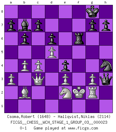 Last move : 0-1 2021 January 15 19:33:31 [Event "FICGS__CHESS__WCH_STAGE_1_GROUP_03__000023"] [Site "FICGS"] [Date "2020.11.05"] [Round "1"] [White "Csoma,Robert"] [Black "Hallqvist,Niklas"] [Result "0-1"] [WhiteElo "1648"] [BlackElo "2114"] 1.c4 e6 2.d4 b6 3.Nc3 Bb4 4.Qc2 Bb7 5.a3 Bxc3+ 6.Qxc3 f5 7.Nf3 Nf6 8.g3 O-O 9.Bg2 Qe8 10.O-O d6 11.b4 Nbd7 12.Bb2 Qh5 13.Rad1 Rae8 14.d5 e5 15.Rfe1 f4 16.e3 fxg3 17.fxg3 e4 18.Nd4 Ne5 19.Rf1 Nfg4 20.h3 Nf2 21.Rd2 Nxh3+ 22.Bxh3 Qxh3 23.Rxf8+ Rxf8 24.Rg2 Rf6 25.Ne2 Nf3+ 26.Kf2 Nh4 0-1 English Opening Kingside Castling by player Black (move 8) Kingside Castling by player White (move 10) Player Black won this chess game. Follow this game move after move (download)Man is a frivolous, a specious creature, and like a Chess player, cares more for the process of attaining his goal than for the goal itself. (Dostoyevsky) Es ist schade, dass viele Schachsportler vergessen, wie wichtig Auftreten und angemessene Kleidung sind. (Alexandra Kosteniuk) Al jugar al Ajedrez entonces, podemos aprender: Primero: Previsión... Segundo: Prudencia... Tercero: Cautela... Y al final, aprendemos del Ajedrez el hábito de no ser desanimados por apariencias malas presentes en el estado de nuestros asuntos, el hábito de la esperanza por una oportunidad favorable y la perseveración de los secretos de los recursos. (Benjamin Franklin) A ce moment-là, je menaçais de comprendre la position ! (Clément L'Heureux) Experiences are the keys to life. (Daniel Parmet)