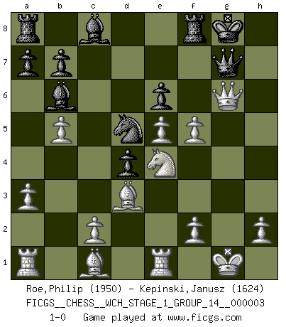 Last move : 1-0 2007 September 21 3:11:37 [Event "FICGS__CHESS__WCH_STAGE_1_GROUP_14__000003"] [Site "FICGS"] [Date "2007.07.11"] [Round "1"] [White "Roe,Philip"] [Black "Kepinski,Janusz"] [Result "1-0"] [WhiteElo "1950"] [BlackElo "1624"] 1.e4 e6 2.d4 d5 3.Nd2 Nf6 4.Bd3 c5 5.e5 Ne4 6.Nxe4 dxe4 7.Bxe4 cxd4 8.Nf3 Bc5 9.O-O Nc6 10.a3 Bb6 11.b4 Qc7 12.Re1 O-O 13.b5 Ne7 14.Bxh7+ Kh8 15.Bd3 Nf5 16.Ng5 g6 17.Qf3 Kg7 18.g4 Ne7 19.Qf6+ Kg8 20.Ne4 Nd5 21.Qg5 Qd7 22.Qh6 f5 23.Qxg6+ Qg7 24.gxf5 1-0 This chess game has been lost on time (started : 2007.07.11 17:11:17) French : Tarrasch, Closed variation Kingside Castling by player White (move 9) Kingside Castling by player Black (move 12) Player White won this chess game. Follow this game move after move (download)I still hope to kill Fischer. (Boris Spassky) Irgendwie scheint mir sonntags früh um 9 Uhr der Killerinstinkt verloren gegangen zu sein. (Alexej Shirov) La captura del Rey enemigo es la finalidad pero no el primer objetivo de la partida. (William Steinitz) Il vaut toujours mieux jouer un plan faux de façon logique que de n'avoir pas de plan du tout. (Victor Kortchnoï) There are two major products that came out of Berkeley: LSD and UNIX. We do not believe this is to be a coincidence. (Jeremy S. Anderson)