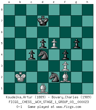 Last move : 0-1 2021 April 23 15:54:29 [Event "FICGS__CHESS__WCH_STAGE_1_GROUP_03__000023"] [Site "FICGS"] [Date "2020.11.05"] [Round "1"] [White "Koudelka,Artur"] [Black "Bovary,Charles"] [Result "0-1"] [WhiteElo "1889"] [BlackElo "1989"] 1.d4 Nf6 2.c4 e6 3.Nc3 Bb4 4.e3 O-O 5.Bd3 d5 6.Nf3 c5 7.O-O b6 8.cxd5 exd5 9.a3 Bxc3 10.bxc3 c4 11.Bc2 Bg4 12.Qe1 Bxf3 13.gxf3 Qd7 14.Kh1 Qh3 15.Qe2 Nc6 16.Rg1 Nh5 17.Bd1 Rae8 18.Qf1 Qxf1 19.Rxf1 f5 20.a4 Na5 21.Ba3 Rf6 22.Rg1 Kf7 23.Rg5 g6 24.f4 Ng7 25.Rb1 Rd8 26.h4 Ne8 27.h5 Re6 28.Kg2 Nf6 29.Bc2 Nb3 30.hxg6+ hxg6 31.Rh1 Nd2 32.Rg3 Rg8 33.Rgh3 a6 34.Rh8 Nde4 35.Bb2 Rxh8 36.Rxh8 Re8 37.Rxe8 Kxe8 38.f3 Nd2 39.Kf2 Kd7 40.Ke2 Nb3 41.Ba3 Ne8 42.e4 Ke6 43.e5 Na5 44.Ke3 Nc6 45.Bc1 Ng7 46.Bd2 Nd8 47.Be1 Kd7 48.Bh4 b5 49.axb5 axb5 50.Bd1 Nge6 51.Be1 Kc7 52.Bf2 Kb6 53.Bg3 Nc6 54.Kd2 Ka5 55.Kc2 b4 56.Bf2 bxc3 57.Kxc3 Na7 58.Kb2 Nb5 59.Be1+ Kb6 60.Ba4 Nxf4 61.Bd2 Ne2 62.Be3 f4 63.Bf2 Kc6 64.Ka1 g5 65.Kb2 Nec3 66.Bc2 Kc7 67.Be1 Ne2 68.Bf2 Nbxd4 69.Bd1 Kd7 0-1 This chess game has been lost on time (started : 2020.11.05 12:58:23) Nimzo-Indian : 4.e3 O-O, 5.Bd3 d5 Kingside Castling by player Black (move 4) Kingside Castling by player White (move 7) Player Black won this chess game. Follow this game move after move (download)He who fears an isolated Queen's Pawn should give up Chess. (Siegbert Tarrasch) Ein typischer, sehr verbreiteter Gedankenschädling ist der, daß der betreffende Amateur von der Annanhme ausgeht, daß jeder einzelne Zug etwas zu leisten habe. (Aaron Nimzowitsch) El ganador de una partida es aquel jugador que hace el penúltimo error. (Savielly Tartakover) L'ordinateur a tué l'originalité. Il n'y a plus guère d'aventures sur l'échiquier. (Jacob Murray) Pretend inferiority and encourage his arrogance. (Sun Tzu)