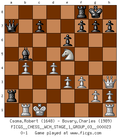 Last move : 0-1 2020 November 19 21:18:58 [Event "FICGS__CHESS__WCH_STAGE_1_GROUP_03__000023"] [Site "FICGS"] [Date "2020.11.05"] [Round "1"] [White "Csoma,Robert"] [Black "Bovary,Charles"] [Result "0-1"] [WhiteElo "1648"] [BlackElo "1989"] 1.d4 Nf6 2.c4 e6 3.Nc3 Bb4 4.Qc2 O-O 5.a3 Bxc3+ 6.Qxc3 b5 7.e3 bxc4 8.Bxc4 Ne4 9.Qc2 d5 10.Bd3 Nd7 11.Bxe4 dxe4 12.Qxe4 Ba6 13.Bd2 Nf6 14.Qf3 Qb8 15.b4 Bb7 16.Qh3 a5 17.Nf3 Ba6 18.Ne5 axb4 19.axb4 Ne4 20.Rb1 Bb5 21.f3 Nxd2 22.Kxd2 Ra2+ 23.Kc1 Qa7 0-1 Nimzo-Indian : Classical, Adorjan gambit Kingside Castling by player Black (move 4) Player Black won this chess game. Follow this game move after move (download)Chess, like love, is infectious at any age. (Flohr) Frage: Was machen Sie mit den Preisen? Anwort: Ich habe Angst, dass meine Freundin davon neue Kleider kauft. (Loek van Wely) Bobby es el jugador de Ajedrez mas fino que este país jamás haya producido. Su memoria para las movidas, su brillantez en soñar combinaciones y su feróz determinación por la victoria son algo extraño. (John Collins) 'L'échange des dames est un coup dur pour les deux adversaires...' Un journaliste lors d'une partie du match Spassky-Fischer Coffee just isn't my cup of tea. (Unknown)