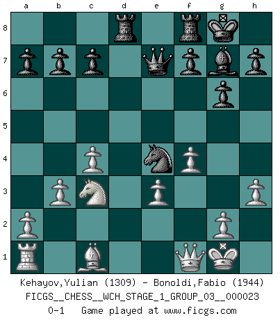 Last move : 0-1 2021 January 4 10:56:55 [Event "FICGS__CHESS__WCH_STAGE_1_GROUP_03__000023"] [Site "FICGS"] [Date "2020.11.05"] [Round "1"] [White "Kehayov,Yulian"] [Black "Bonoldi,Fabio"] [Result "0-1"] [WhiteElo "1309"] [BlackElo "1944"] 1.d4 Nf6 2.c4 g6 3.Nc3 Bg7 4.e3 O-O 5.Nf3 d6 6.Be2 Nbd7 7.O-O e5 8.dxe5 dxe5 9.b3 Qe7 10.h3 e4 11.Nh2 Ne5 12.f3 Bf5 13.f4 Rad8 14.Qc2 Nf3+ 15.Nxf3 exf3 16.Qb2 fxe2 17.Qxe2 Bd3 18.Qf2 Bxf1 19.Qxf1 Ne4 0-1 King's Indian defense, 3.Nc3 Kingside Castling by player Black (move 4) Kingside Castling by player White (move 7) Player Black won this chess game. Follow this game move after move (download)When you absolutely don't know what to do anymore, it is time to panic. (John van der Wiel) Es gibt zwei Arten von Opfern: Korrekte und meine. (Mikhail Nekhemyevich Tal) En el Ajedrez, tal como en la vida, las bendiciones de hoy pueden ser el veneno del mañana. (Assaic) Mais l'homme est une créature légère et illogique : semblable au joueur d'échecs, il n'aime que le processus du but à atteindre, non le but lui-même. (Dostoïevsky) Nobody is always a winner, and anybody who says he is, is either a liar or doesn't play poker. (Amarillo Slim)