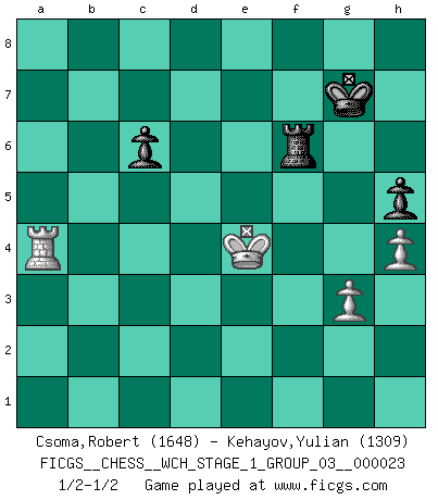 Last move : 1/2-1/2 2021 February 13 19:37:38 [Event "FICGS__CHESS__WCH_STAGE_1_GROUP_03__000023"] [Site "FICGS"] [Date "2020.11.05"] [Round "1"] [White "Csoma,Robert"] [Black "Kehayov,Yulian"] [Result "1/2-1/2"] [WhiteElo "1648"] [BlackElo "1309"] 1.f4 d5 2.Nf3 Nf6 3.e3 e6 4.Be2 Be7 5.O-O O-O 6.d3 Nc6 7.Nbd2 Bd6 8.b3 a6 9.Bb2 Be7 10.e4 dxe4 11.Nxe4 Nxe4 12.dxe4 Qxd1 13.Raxd1 Nb4 14.c3 Nc6 15.Nd4 Nxd4 16.cxd4 Bf6 17.e5 Be7 18.d5 exd5 19.Rxd5 Be6 20.R5d1 Rad8 21.f5 Bc8 22.f6 gxf6 23.exf6 Bc5+ 24.Kh1 Rfe8 25.Bf3 Rxd1 26.Rxd1 c6 27.Rc1 Bb6 28.g3 Re3 29.Kg2 Bh3+ 30.Kxh3 Rxf3 31.Kg4 Rf2 32.Be5 Rxa2 33.h3 h6 34.Bf4 Kh7 35.Rd1 Kg6 36.Rd7 Rb2 37.Rxb7 Rxb3 38.Rd7 Be3 39.Rd6 Bxf4 40.Kxf4 Rc3 41.h4 h5 42.Ke5 a5 43.Rd8 Re3+ 44.Kf4 Re6 45.Rg8+ Kh7 46.Rg7+ Kh6 47.Rxf7 Kg6 48.Ra7 Rxf6+ 49.Ke4 a4 50.Rxa4 Kg7 1/2-1/2 Bird's Opening Kingside Castling by player White (move 5) Kingside Castling by player Black (move 5) 10 pieces endgame at move 47 : White KRPPP , Black KRPPP WHITE : King + 1 Rook 3 Pawns BLACK : King + 1 Rook 3 Pawns 9 pieces endgame at move 48 : White KRPP , Black KRPPP WHITE : King + 1 Rook 2 Pawns BLACK : King + 1 Rook 3 Pawns 8 pieces endgame at move 50 : White KRPP , Black KRPP WHITE : King + 1 Rook 2 Pawns BLACK : King + 1 Rook 2 Pawns This chess game ended in a draw. Follow this game move after move (download)Though most people love to look at the games of the great attacking masters, some of the most successful players in history have been the quiet positional players. They slowly grind you down by taking away your space, tying up your pieces, and leaving you with virtually nothing to do ! (Yasser Seirawan) Spiel ein langweiliges Spiel zu Ende und lustige Dinge können passieren. (Hans Ree) Buenas posiciones no logran ganar juegos, buenas movidas sí. (Gerald Abrahams) Echiquier : carré parfait, comme la Jérusalem nouvelle décrite par l'auteur de l'Apocalypse, huit cases sur huit, exaltation du chiffre 4, symbole du cosmos aux quatre horizons... où le noir et le blanc, l'ombre et la lumière, le mal et le bien s'entremêlent et se conjuguent. (Robert Couffignal, Le Gambit du poète) 98% of all statistics are made up. (Author unknown)