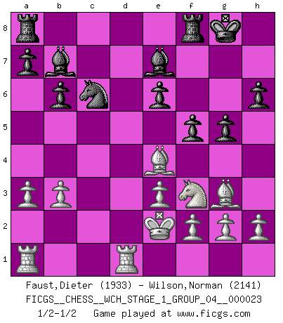 Last move : 1/2-1/2 2020 December 6 12:21:11 [Event "FICGS__CHESS__WCH_STAGE_1_GROUP_04__000023"] [Site "FICGS"] [Date "2020.11.05"] [Round "1"] [White "Faust,Dieter"] [Black "Wilson,Norman"] [Result "1/2-1/2"] [WhiteElo "1933"] [BlackElo "2141"] 1.d4 d5 2.c4 e6 3.Nc3 Be7 4.Nf3 Nf6 5.Bf4 O-O 6.e3 b6 7.cxd5 Nxd5 8.Nxd5 Qxd5 9.Bd3 Qa5+ 10.Ke2 c5 11.Qd2 Qa4 12.b3 Qa3 13.Qc1 Qa5 14.Qd2 Qxd2+ 15.Kxd2 Bb7 16.dxc5 Bxc5 17.Ke2 h6 18.Rhd1 Nc6 19.a3 g5 20.Bg3 Be7 21.Be4 f5 1/2-1/2 QGD : Charousek (Petrosian) variation Kingside Castling by player Black (move 5) This chess game ended in a draw. Follow this game move after move (download)Chess is imagination. (David Bronstein) Wenn es im Universum noch irgendwo intelligente Lebewesen gibt, dann kennen sie Go. (Emanuel Lasker) Bobby es el jugador de Ajedrez mas fino que este país jamás haya producido. Su memoria para las movidas, su brillantez en soñar combinaciones y su feróz determinación por la victoria son algo extraño. (John Collins) La vie et les Echecs sont tous les deux une lutte constante. (Lasker) Looking at the proliferation of personal web pages on the Net, it looks like very soon everyone on Earth will have 15 megabytes of fame. (M.G. Sriram)