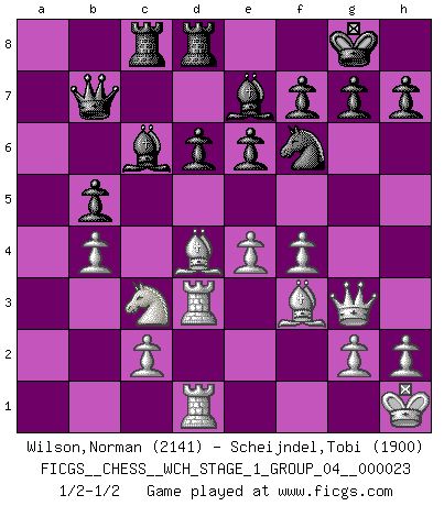 Last move : 1/2-1/2 2020 November 20 11:12:37 [Event "FICGS__CHESS__WCH_STAGE_1_GROUP_04__000023"] [Site "FICGS"] [Date "2020.11.05"] [Round "1"] [White "Wilson,Norman"] [Black "Scheijndel,Tobi"] [Result "1/2-1/2"] [WhiteElo "2141"] [BlackElo "1900"] 1.e4 c5 2.Nf3 e6 3.d4 cxd4 4.Nxd4 Nc6 5.Nc3 Qc7 6.Be3 a6 7.Be2 Nf6 8.a3 Be7 9.f4 O-O 10.O-O d6 11.Qe1 Nxd4 12.Bxd4 b5 13.Qg3 Bb7 14.Bf3 Rfd8 15.Rad1 Bc6 16.Rd3 a5 17.b4 axb4 18.axb4 Qb7 19.Rfd1 Rac8 20.Ra1 Ra8 21.Rad1 Rac8 22.Kh1 1/2-1/2 Sicilian : Taimanov variation Kingside Castling by player Black (move 9) Kingside Castling by player White (move 10) This chess game ended in a draw. Follow this game move after move (download)The beauty of a move lies not in its' appearance but in the thought behind it. (Siegbert Tarrasch) Ich glaube, ich kenne inzwischen die Gründe für mein Versagen: schachliche Charakterfehler. Ich war nie ein Wunderkind und in meiner gesamten menschlichen Entwicklung immer zu langsam. (Viktor Kortschnoi) Si el ingenio solamente fuese necesario para lucirse, las mujeres serían las mejores jugadoras de Ajedrez del mundo. (Albin) Le profane ne songe pas à la somme de jouissance dont il se prive, qui méconnaît ce jeu aux ressources aussi variées que passionnantes. (Jean-Marie Jeanton-Lamarche) He who defends everything defends nothing. (Frederick the Great)