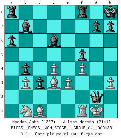 Last move : 0-1 2020 December 10 11:1:24 [Event "FICGS__CHESS__WCH_STAGE_1_GROUP_04__000023"] [Site "FICGS"] [Date "2020.11.05"] [Round "1"] [White "Hadden,John"] [Black "Wilson,Norman"] [Result "0-1"] [WhiteElo "1227"] [BlackElo "2141"] 1.d4 d5 2.c4 c6 3.Nc3 Nf6 4.h3 dxc4 5.e3 b5 6.Nf3 Bb7 7.Be2 e6 8.O-O Nbd7 9.a4 a6 10.axb5 cxb5 11.b3 b4 12.Nb1 c3 13.Ra4 Ne4 14.Bd3 Nb6 15.Ra5 Bd6 16.Qc2 f5 17.Ne5 O-O 18.Nc4 Nxc4 19.Bxc4 Qxa5 20.Bxe6+ Kh8 21.Bc4 Qd8 22.Bd3 Qh4 23.Qe2 Ng5 24.f4 Nxh3+ 25.gxh3 Qg3+ 26.Qg2 Qxg2+ 0-1 QGD Slav defense Kingside Castling by player White (move 8) Kingside Castling by player Black (move 17) Player Black won this chess game. Follow this game move after move (download)In Fischer's hands, a slight theoretical advantage is as good a being a Queen ahead. (Isaac Kashdan) Der Umstand, daß uns eine 7 Stunden Zeitkontrolle ermöglicht eine großartige, tiefe Partie zu spielen, ist für die Massenmedien nicht weiter von Bedeutung. (Alexej Shirov) Después de la respuesta de las negras a 1.e4 con 1..e5, se quedan siempre tratando de entrar dentro del juego. (Howard Staunton) Il vaut toujours mieux jouer un plan faux de façon logique que de n'avoir pas de plan du tout. (Victor Kortchnoï) There are two major products that came out of Berkeley: LSD and UNIX. We do not believe this is to be a coincidence. (Jeremy S. Anderson)