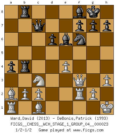 Last move : 1/2-1/2 2021 February 26 1:57:7 [Event "FICGS__CHESS__WCH_STAGE_1_GROUP_04__000023"] [Site "FICGS"] [Date "2020.11.05"] [Round "1"] [White "Ward,David"] [Black "DeBonis,Patrick"] [Result "1/2-1/2"] [WhiteElo "2013"] [BlackElo "1993"] 1.e4 c5 2.Nf3 d6 3.d4 cxd4 4.Nxd4 Nf6 5.Nc3 a6 6.Bc4 e6 7.Bb3 Nbd7 8.Bg5 Nc5 9.f4 Be7 10.Qf3 O-O 11.O-O Qc7 12.f5 b5 13.a3 Rb8 14.Ba2 b4 15.axb4 Rxb4 16.fxe6 Nxe6 17.Nxe6 Bxe6 18.Bc1 a5 19.h3 a4 20.Kh1 Rfb8 21.Rf2 Bf8 1/2-1/2 Comment by player 1 : David Ward : Thank you and good luck to you also. Sicilian : Najdorf, Lipnitzky attack Kingside Castling by player Black (move 10) Kingside Castling by player White (move 11) This chess game ended in a draw. Follow this game move after move (download)No price is too great for the scalp of the enemy King. (Koblentz) Jeder weiß, dass Gasprom Putins persönliches Machtinstrument ist. Die Firma wird vom Kreml aus geleitet und wird schon deshalb nie transparent sein. (Garry Kasparov) De eso se trata el Ajedrez. Un día le das una lección a tu oponente y al día siguiente el te da una a tí. (Bobby Fischer) La vie est comme un jeu d'échecs : nous esquissons un plan, mais celui-ci est tributaire de ce que daignent faire l'adversaire aux échecs et le destin dans la vie. (Arthur Schopenhauer) Life doesn't imitate art, it imitates bad television. (Woody Allen)