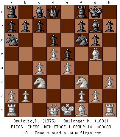 Last move : 1-0 2007 August 24 11:22:4 [Event "FICGS__CHESS__WCH_STAGE_1_GROUP_14__000003"] [Site "FICGS"] [Date "2007.07.11"] [Round "1"] [White "Dautovic,Dzenan"] [Black "Bellanger,Michel"] [Result "1-0"] [WhiteElo "1875"] [BlackElo "1681"] 1.d4 Nf6 2.c4 g6 3.Nc3 Bg7 4.e4 d6 5.Nf3 O-O 6.h3 e5 7.d5 Na6 8.Bg5 1-0 This chess game has been lost on time (started : 2007.07.11 17:11:17) King's Indian : 5.Nf3 Kingside Castling by player Black (move 5) Player White won this chess game. Follow this game move after move (download)The only thing Chess players have in common is Chess. (Lodewijk Prins) Ich bin Weltmeister und muß mit niemandem irgend etwas diskutieren. (Viswanathan Anand) Las ideas audaces son como las piezas del Ajedrez que avanzan hacia adelante. Ellas pueden ser vencidas, pero también pueden iniciar una partida victoriosa. (Goethe) Ce n'est pas pour s'amuser qu'il joue aux échecs : il célèbre un culte. (Vladimir Nabokov) If you are good, you will be assigned all the work. If you are really good, you will get out of it. (Dan Rotaru)