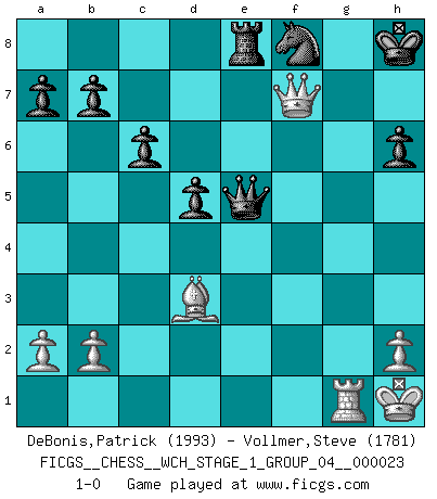 Last move : 1-0 2021 March 16 0:18:52 [Event "FICGS__CHESS__WCH_STAGE_1_GROUP_04__000023"] [Site "FICGS"] [Date "2020.11.05"] [Round "1"] [White "DeBonis,Patrick"] [Black "Vollmer,Steve"] [Result "1-0"] [WhiteElo "1993"] [BlackElo "1781"] 1.d4 d5 2.c4 e6 3.Nc3 Nf6 4.cxd5 exd5 5.Bg5 Be7 6.e3 O-O 7.Bd3 c6 8.Nge2 Nbd7 9.Qc2 h6 10.Bh4 Re8 11.f3 Nf8 12.O-O N6h7 13.Bf2 Bh4 14.e4 Bxf2+ 15.Rxf2 Ng5 16.e5 Nge6 17.f4 Qh4 18.Raf1 Bd7 19.f5 Nxd4 20.Nxd4 Qxd4 21.e6 fxe6 22.f6 gxf6 23.Ne2 Qe3 24.Kh1 f5 25.Rf3 Qe5 26.g4 Re7 27.Ng3 Rf7 28.gxf5 exf5 29.Nxf5 Bxf5 30.Rxf5 Rxf5 31.Rxf5 Qe1+ 32.Rf1 Qe5 33.Qf2 Re8 34.Qf7+ Kh8 35.Rg1 1-0 QGD : Exchange, positional line Kingside Castling by player Black (move 6) Kingside Castling by player White (move 12) Player White won this chess game. Follow this game move after move (download)When you see a good move, look for a better one. (Emanuel Lasker) Später, ... hatte ich zunehmend Erfolg in entscheidenden Partien. Vielleicht weil ich eine einfache Wahrheit erkannte: nicht nur ich hatte Angst, auch mein Gegner. (Mikhail Nekhemyevich Tal) El Ajedrez se juega con la mente... ¡no con las manos!. (Renaud y Kahn) La vie et les Echecs sont tous les deux une lutte constante. (Lasker) The Internet is so big, so powerful and pointless that for some people it is a complete substitute for life. (Andrew Brown)