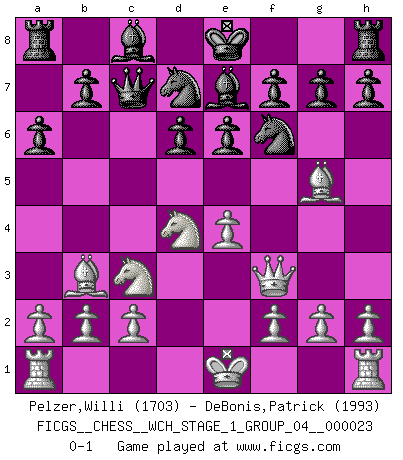Last move : 0-1 2021 January 3 5:55:32 [Event "FICGS__CHESS__WCH_STAGE_1_GROUP_04__000023"] [Site "FICGS"] [Date "2020.11.05"] [Round "1"] [White "Pelzer,Willi"] [Black "DeBonis,Patrick"] [Result "0-1"] [WhiteElo "1703"] [BlackElo "1993"] 1.e4 c5 2.Nf3 d6 3.d4 cxd4 4.Nxd4 Nf6 5.Nc3 a6 6.Bc4 e6 7.Bg5 Be7 8.Qf3 Qc7 9.Bb3 Nbd7 0-1 This chess game has been lost on time (started : 2020.11.05 12:58:25) Sicilian : Najdorf, Lipnitzky attack Player Black won this chess game. Follow this game move after move (download)The King is a fighting piece. Use it ! (Wilhelm Steinitz) Es ist besser die Steine des Gegners zu opfern. (Savielly Grigorievitsch Tartakower) El Ajedrez moderno está demasiado preocupado con cosas como la estructura de Peones. Olvidenlo, el Jaque Mate termina la partida. (Nigel Short) Les Echecs représentent une sphère d'idées créatrices basée sur la volonté des deux protagonistes. (Smyslov) The ego is not master in its own house. (Sigmund Freud)