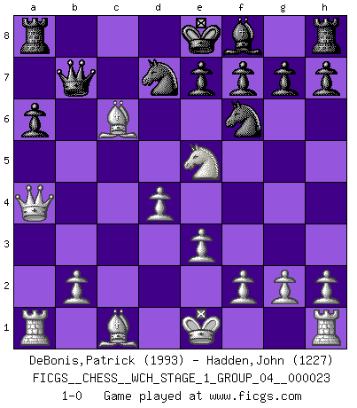 Last move : 1-0 2020 December 24 0:35:4 [Event "FICGS__CHESS__WCH_STAGE_1_GROUP_04__000023"] [Site "FICGS"] [Date "2020.11.05"] [Round "1"] [White "DeBonis,Patrick"] [Black "Hadden,John"] [Result "1-0"] [WhiteElo "1993"] [BlackElo "1227"] 1.d4 d5 2.c4 dxc4 3.Nf3 Nf6 4.e3 b5 5.a4 c6 6.axb5 cxb5 7.Nc3 a6 8.Nxb5 Qb6 9.Na3 Be6 10.Nxc4 Bxc4 11.Qa4+ Bb5 12.Bxb5+ Nbd7 13.Ne5 Qb7 14.Bc6 1-0 QGA, 4.e3 Player White won this chess game. Follow this game move after move (download)One doesn't have to play well, it's enough to play better than your opponent. (Siegbert Tarrasch) Ich verlor meine Bürgerrechte, mein Gehalt wurde mir nicht mehr bezahlt und ich wurde zensiert und durfte nicht mehr ins Ausland reisen. [nach dem Match Fischer-Taimanov 6:0] (Mark Taimanov) Realmente no sabemos como el juego fue inventado, aunque hay sospechas. Tan pronto como descubramos a los culpables, se los haremos saber. (Bruce Pandolfini) Lorsque vous vous retrouvez devant une position atroce, ne tendez pas un ultime piège dérisoire avec l'intention d'abandonner si l'adversaire le déjoue ! Faites-vous plutôt un devoir de résister comme si votre vie en dépendait. Jouez le coup qui vous déplairait au centuple si vous étiez dans la peau de votre tortionnaire ! Everything in life is luck. (Donald Trump)