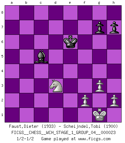 Last move : 1/2-1/2 2020 December 29 18:55:11 [Event "FICGS__CHESS__WCH_STAGE_1_GROUP_04__000023"] [Site "FICGS"] [Date "2020.11.05"] [Round "1"] [White "Faust,Dieter"] [Black "Scheijndel,Tobi"] [Result "1/2-1/2"] [WhiteElo "1933"] [BlackElo "1900"] 1.d4 Nf6 2.Nf3 e6 3.c4 d5 4.Nc3 Be7 5.Bf4 O-O 6.e3 Nbd7 7.c5 Nh5 8.Bd3 Nxf4 9.exf4 b6 10.b4 a5 11.a3 c6 12.O-O Qc7 13.g3 Ba6 14.Bxa6 Rxa6 15.Qe2 Ra7 16.f5 e5 17.cxb6 Qxb6 18.dxe5 axb4 19.axb4 Bxb4 20.Rxa7 Qxa7 21.Na2 Ba3 22.Nc1 Qa4 23.Nd3 Qe4 24.Re1 Qxf5 25.Nd4 Qe4 26.Qxe4 dxe4 27.Rxe4 Rc8 28.e6 fxe6 29.Rxe6 Nc5 30.Nxc5 Bxc5 31.Rxc6 Rxc6 32.Nxc6 Kf7 33.Ne5+ Ke6 34.Nd3 1/2-1/2 Queen's pawn game Kingside Castling by player Black (move 5) Kingside Castling by player White (move 12) 10 pieces endgame at move 31 : White KNPPP , Black KRBPP WHITE : King + 1 Knight 3 Pawns BLACK : King + 1 Rook 1 Bishop 2 Pawns 9 pieces endgame at move 32 : White KNPPP , Black KBPP WHITE : King + 1 Knight 3 Pawns BLACK : King + 1 Bishop 2 Pawns This chess game ended in a draw. Follow this game move after move (download)The Pawns are the soul of the game. (Francois Andre Danican Philidor) Lisa Lane, amerikanische Schachmeisterin, hatte Fischer einmal als stärksten lebenden Spieler bezeichnet. Antwort: Das ist richtig, aber Lisa Lane ist eigentlich nicht in der Lage, das zu beurteilen. (Robert James Fischer) Las ideas audaces son como las piezas del Ajedrez que avanzan hacia adelante. Ellas pueden ser vencidas, pero también pueden iniciar una partida victoriosa. (Goethe) L'ordinateur a tué l'originalité. Il n'y a plus guère d'aventures sur l'échiquier. (Jacob Murray) I can't decide which is riskier; taking crazy risks, or taking advice on crazy risks from a crazy risk taker. (Gregory House in House M.D.)