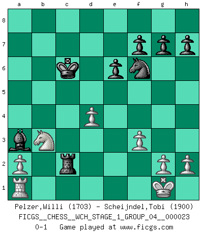 Last move : 0-1 2020 November 12 11:28:10 [Event "FICGS__CHESS__WCH_STAGE_1_GROUP_04__000023"] [Site "FICGS"] [Date "2020.11.05"] [Round "1"] [White "Pelzer,Willi"] [Black "Scheijndel,Tobi"] [Result "0-1"] [WhiteElo "1703"] [BlackElo "1900"] 1.e4 c5 2.Nf3 e6 3.d4 cxd4 4.Nxd4 Nc6 5.c3 Nf6 6.Bd3 d5 7.Nxc6 bxc6 8.exd5 cxd5 9.Qa4+ Bd7 10.Bb5 Rb8 11.Bxd7+ Qxd7 12.Qxd7+ Kxd7 13.O-O Bd6 14.b3 Rhc8 15.f3 a5 16.Be3 a4 17.bxa4 Ra8 18.Rc1 Rxa4 19.Nd2 Ba3 20.Rc2 d4 21.Bxd4 Rxd4 22.cxd4 Rxc2 23.Nb3 Kc6 0-1 Sicilian defense Kingside Castling by player White (move 13) Player Black won this chess game. Follow this game move after move (download)It is no time to be playing Chess when the house is on fire. (Italian Proverb) Taktik ist was man tun muß, wenn etwas zu tun ist. Strategie ist was man tun muß, wenn nichts zu tun ist. (Savielly Grigorievitsch Tartakower) Yo he agregado estos principios a la ley: pongan los Caballos en acción antes de que los dos Alfiles sean desarrollados. (Emanuel Lasker) Les sacrifices démontrent seulement que quelqu'un a gaffé. (Savielly Tartacover) Thibault, I ask for draw. Game 13876. - Sorry Ilmars, you won. (FICGS chat)