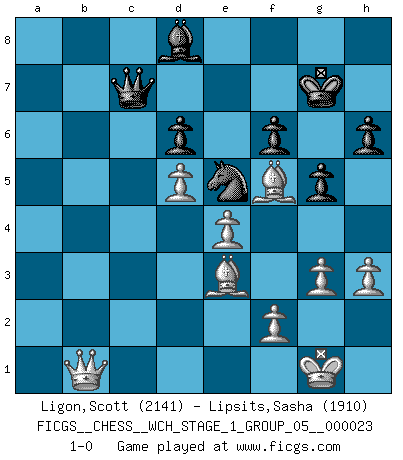 Last move : 1-0 2021 January 6 14:14:16 [Event "FICGS__CHESS__WCH_STAGE_1_GROUP_05__000023"] [Site "FICGS"] [Date "2020.11.05"] [Round "1"] [White "Ligon,Scott"] [Black "Lipsits,Sasha"] [Result "1-0"] [WhiteElo "2141"] [BlackElo "1910"] 1.e4 e5 2.Nf3 Nc6 3.Bb5 a6 4.Ba4 Nf6 5.O-O Be7 6.Re1 b5 7.Bb3 d6 8.c3 O-O 9.h3 Bb7 10.d4 Re8 11.Nbd2 Bf8 12.a3 h6 13.Bc2 Nb8 14.b3 Nbd7 15.Bb2 c6 16.Bd3 Nh5 17.c4 Nf4 18.Bf1 exd4 19.Nxd4 Ne5 20.Qc2 c5 21.Nf5 b4 22.axb4 cxb4 23.Ne3 Ne6 24.Nd5 a5 25.Re3 Nc5 26.Rae1 Qb8 27.Kh2 Bc6 28.Rg3 Ng6 29.Bd4 a4 30.bxa4 Ne6 31.Ba1 Rxa4 32.Kg1 Qa7 33.Nb3 Nc5 34.Bb2 Nxb3 35.Rxb3 Bxd5 36.cxd5 Rb8 37.Rb1 Ne5 38.Bc1 g5 39.Bd2 Ra2 40.R1b2 Rxb2 41.Qxb2 Bg7 42.Qc2 Qc5 43.Qb1 Nd7 44.Rxb4 Rxb4 45.Bxb4 Qb6 46.Bd3 f6 47.Ba3 Qc7 48.Be2 Ne5 49.Bg4 Bf8 50.Bf5 Be7 51.Bc1 Bd8 52.Be3 Kg7 53.g3 1-0 Ruy Lopez : Closed Kingside Castling by player White (move 5) Kingside Castling by player Black (move 8) Player White won this chess game. Follow this game move after move (download)The isolated Pawn casts gloom over the entire chessboard. (Aaron Nimzovich) Das Blackmar-Diemer-Gambit verändert den ganzen Menschen! (Emil Joseph Diemer) La batalla por la última verdad nunca sera ganada. Y es por eso que el Ajedrez es tan fascinante. (Hans Kmoch) Aux échecs, les retours au sommet sont rares : les dommages psychologiques consécutifs à une défaite sont trop sévères. (Daily Telegraph) The leaves of memory seemed to make a mournful rustling in the dark. (Henry Wadsworth Longfellow)