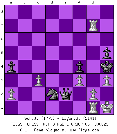 Last move : 0-1 2021 February 8 5:2:31 [Event "FICGS__CHESS__WCH_STAGE_1_GROUP_05__000023"] [Site "FICGS"] [Date "2020.11.05"] [Round "1"] [White "Pech,Jaroslav senior"] [Black "Ligon,Scott"] [Result "0-1"] [WhiteElo "1779"] [BlackElo "2141"] 1.e4 c5 2.Nf3 Nc6 3.d4 cxd4 4.Nxd4 Nf6 5.Nc3 e5 6.Ndb5 d6 7.Bg5 a6 8.Na3 b5 9.Bxf6 gxf6 10.Nd5 f5 11.Bd3 Be6 12.O-O Bxd5 13.exd5 Ne7 14.Nxb5 Bg7 15.Nc3 e4 16.Bc4 O-O 17.Qh5 Qc8 18.Bb3 Bxc3 19.bxc3 f4 20.Qg5+ Ng6 21.Qf6 Re8 22.Qxd6 a5 23.Ba4 Rd8 24.Qc6 Qf5 25.f3 e3 26.Rfd1 Qg5 27.Kh1 Ne5 28.Qb6 Kh8 29.Qd4 Ra6 30.d6 Raxd6 31.Qxd6 Rxd6 32.Rxd6 Nc4 33.Rd4 Qc5 34.Bb3 Nb2 35.Rg1 Qxc3 36.Rd8+ Kg7 37.Rd7 a4 38.Bxf7 Kf6 39.Bg8 e2 40.Rf7+ Kg5 41.Re7 Qd2 42.h3 Nd1 43.Bc4 Ne3 44.Bxe2 Qxe2 45.Rg7+ Kh4 46.Kh2 Nf1+ 47.Kh1 h5 48.c3 Nd2 0-1 Sicilian : Pelikan (Lasker/Sveshnikov) variation Kingside Castling by player White (move 12) Kingside Castling by player Black (move 16) Player Black won this chess game. Follow this game move after move (download)Blessed be the memory of him who gave the world this immortal game. (A. G. Gardiner) Es ist nicht das erste mal, dass sich die FIDE dem Arabischen Geld gebeugt hat (über die FIDE WM 2004 in Lybien). (Larry Evans) Ciertamente, de todas la drogas del mundo, el Ajedrez debe ser el mas placentero permamentemente. (Assiac) Il a essayé de se convaincre qu'il pourrait empêcher toutes les erreurs et ne jamais perdre. L'horreur ! Gary Kasparov au sujet de Robert Fischer. Without enthusiasm, virtue functions not at all, and vice only poorly. (Mignon McLaughlin, The Neurotic's Notebook, 1960)