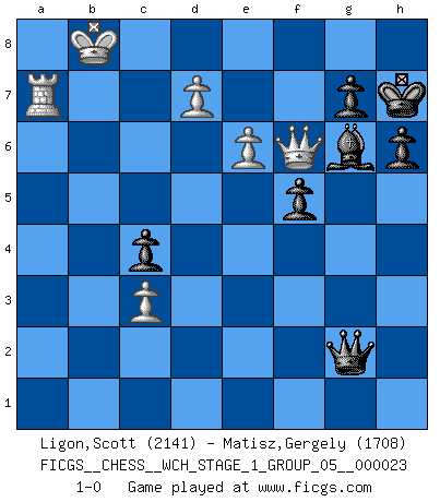 Last move : 1-0 2021 March 6 3:16:45 [Event "FICGS__CHESS__WCH_STAGE_1_GROUP_05__000023"] [Site "FICGS"] [Date "2020.11.05"] [Round "1"] [White "Ligon,Scott"] [Black "Matisz,Gergely"] [Result "1-0"] [WhiteElo "2141"] [BlackElo "1708"] 1.e4 e6 2.d4 d5 3.Nc3 Bb4 4.e5 Ne7 5.a3 Bxc3+ 6.bxc3 c5 7.Qg4 Qa5 8.Bd2 Kf8 9.a4 h6 10.h4 Nbc6 11.Nf3 c4 12.Be2 b5 13.O-O bxa4 14.Ra2 Bd7 15.Rfa1 Qd8 16.Rxa4 a5 17.h5 Ra6 18.Qh3 Na7 19.R4a2 a4 20.Nh4 Kg8 21.g4 Nb5 22.f4 f5 23.Ng6 fxg4 24.Bxg4 a3 25.Qh4 Kf7 26.Nxh8+ Qxh8 27.Bc1 Qa8 28.Kf2 Ra7 29.f5 exf5 30.Bf3 Ra6 31.Bxa3 Nxa3 32.Rg1 Qf8 33.Qh1 Kg8 34.Rga1 Nc8 35.Qc1 Qd8 36.Kf1 Qh4 37.Rxa3 Rxa3 38.Rxa3 Qh3+ 39.Bg2 Qxh5 40.Bxd5+ Kh7 41.Qd2 Ne7 42.Bg2 Ng6 43.Ra1 Qh2 44.Re1 Nf4 45.d5 Nh5 46.e6 Ng3+ 47.Kf2 Be8 48.Qd4 Bg6 49.Qf4 Nh1+ 50.Kf3 Bh5+ 51.Ke3 Qxg2 52.Kd4 Ng3 53.d6 Bg6 54.d7 Nh5 55.Qe5 Nf6 56.Kc5 Qd2 57.Kc6 Qg2+ 58.Kb6 Ng4 59.Qc5 Qd2 60.Ra1 Nf6 61.Ra7 Qd1 62.Qd4 Qb1+ 63.Ka6 Qa2+ 64.Kb7 Qxc2 65.Qxf6 Qg2+ 66.Kb8 1-0 French : Winawer, Advance variation Kingside Castling by player White (move 13) Player White won this chess game. Follow this game move after move (download)A Chess game is divided into three stages: the first, when you hope you have the advantage, the second when you believe you have an advantage, and the third... when you know you're going to lose ! (Savielly Tartakower) Im Schach gewinnt jeder. Hat man Freunde am Spiel - und das ist die Hauptsache - ist auch der Verlust einer Partie kein Unglück. (David Bronstein) El jugador de combinación piensa hacia adelante; comienza de la posición dada y trabaja las movidas contundentes en su mente. (Emanuel Lasker) Karpov est une pièce de musée. (Garry Kasparov) Bobby never cared about money, though. His only desire was to prove that his choices were correct: He wanted chess to be important because he was a chess player, and he wanted to be important. Bobby knew money was important, but he didn't have a clue why, outside of clothes and status. The only way he could accomplish what he wanted was to fight for a lot of money. Once he got it, he gave it away. He did not know how to spend it. And once he'd become champion, after, essentially, sacrificing his life for it, he didn't know how to spend his time. (Bob Wade)