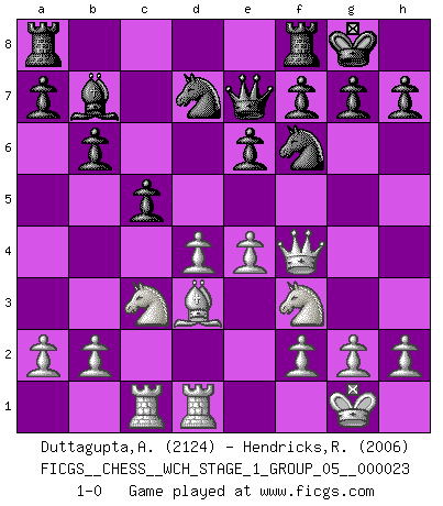 Last move : 1-0 2021 February 12 15:26:0 [Event "FICGS__CHESS__WCH_STAGE_1_GROUP_05__000023"] [Site "FICGS"] [Date "2020.11.05"] [Round "1"] [White "Duttagupta,Aniruddha"] [Black "Hendricks,Richard"] [Result "1-0"] [WhiteElo "2124"] [BlackElo "2006"] 1.d4 Nf6 2.c4 e6 3.Nf3 Bb4+ 4.Bd2 Bxd2+ 5.Qxd2 O-O 6.Nc3 d5 7.e3 b6 8.cxd5 Nxd5 9.Bd3 Bb7 10.Rc1 Nf6 11.O-O c5 12.Rfd1 Nbd7 13.e4 Qe7 14.Qf4 1-0 This chess game has been lost on time (started : 2020.11.05 12:58:26) Bogo-Indian defense Kingside Castling by player Black (move 5) Kingside Castling by player White (move 11) Player White won this chess game. Follow this game move after move (download)Pawns: they are the soul of this game, they alone form the attack and defense. (Philidor) Ich suche im Schach immer etwas Eigenes. Riskantes Spiel im Stile schachlicher Musketiere ist nicht meine Sache, auch wenn es vielen Freunden scharfer Wendungen gefällt. (Anatoly Karpov) El Ajedrez era la lengua materna de Capablanca. (Reti) Les Echecs représentent une sphère d'idées créatrices basée sur la volonté des deux protagonistes. (Smyslov) Big Chess is a place for big hallucinations. (Thibault de Vassal)