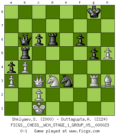 Last move : 0-1 2021 April 6 0:1:51 [Event "FICGS__CHESS__WCH_STAGE_1_GROUP_05__000023"] [Site "FICGS"] [Date "2020.11.05"] [Round "1"] [White "Shklyaev,Sergei"] [Black "Duttagupta,Aniruddha"] [Result "0-1"] [WhiteElo "2000"] [BlackElo "2124"] 1.e4 c5 2.Nf3 d6 3.d4 cxd4 4.Nxd4 Nf6 5.Nc3 g6 6.Be3 Bg7 7.f3 O-O 8.Qd2 Nc6 9.O-O-O d5 10.exd5 Nxd5 11.Nxc6 bxc6 12.Bd4 Bxd4 13.Qxd4 Qb6 14.Na4 Qc7 15.Nc5 a5 16.h4 h5 17.Bc4 a4 18.g4 e5 19.Qe4 Ra5 20.Nd3 Be6 21.Qe1 hxg4 22.h5 g5 23.Rg1 Qb6 24.Qd2 e4 25.fxe4 Ne3 26.Bxe6 Nxd1 27.e5 Ne3 28.b4 Rb5 29.Bxg4 Rd8 30.Rg3 Rxe5 31.Qc3 Rb5 32.Bh3 Rd6 33.a3 f6 0-1 This chess game has been lost on time (started : 2020.11.05 12:58:26) Sicilian : Dragon, Yugoslav attack, 7...O-O Kingside Castling by player Black (move 7) Queenside Castling by player White (move 9) Player Black won this chess game. Follow this game move after move (download)Up to this point White has been following well-known analysis. But now he makes a fatal error: he begins to use his own head. (Siegbert Tarrasch) Das Schachspiel hat wie die Liebe, die Musik, die Fähigkeit, den Menschen glücklich zu machen. Ich habe ein leises Gefühl des Bedauerns für jeden, der das Schachspiel nicht kennt, so wie ich jeden bedaure, der die Liebe nicht kennt. (Siegbert Tarrasch) Cuando tengas duda... ¡juega al Ajedrez!. (Tevis) Même un GMI sait rarement calculer sur plus de cinq coups une attaque à sacrifices. (Rudolf Spielmann) Luck is when opportunity knocks and you answer. (Anonymous)