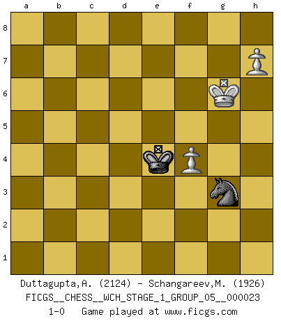 Last move : 1-0 2021 March 27 18:59:27 [Event "FICGS__CHESS__WCH_STAGE_1_GROUP_05__000023"] [Site "FICGS"] [Date "2020.11.05"] [Round "1"] [White "Duttagupta,Aniruddha"] [Black "Schangareev,Mirzian"] [Result "1-0"] [WhiteElo "2124"] [BlackElo "1926"] 1.e4 Nc6 2.d4 d5 3.Nc3 dxe4 4.d5 Nb8 5.Nxe4 Nf6 6.Nxf6+ exf6 7.Bf4 Bd6 8.Qe2+ Be7 9.O-O-O O-O 10.Qf3 Bd6 11.Qg3 Bxf4+ 12.Qxf4 Nd7 13.Ne2 Re8 14.Nc3 a6 15.Be2 b5 16.a4 Ne5 17.Rhe1 Bd7 18.Qd4 bxa4 19.Nxa4 Bxa4 20.Qxa4 Qd6 21.f4 Nd7 22.g3 a5 23.Bf3 Reb8 24.Re3 Nc5 25.Qc6 a4 26.Rd4 a3 27.bxa3 g6 28.Be2 f5 29.Rb4 Qxc6 30.Rxb8+ Rxb8 31.dxc6 Kf8 32.Rc3 Ne6 33.Rd3 Rd8 34.Rd7 Rxd7 35.cxd7 Ke7 36.Bb5 Nd8 37.Kb2 c6 38.Bc4 Kxd7 39.Kc3 Kc7 40.a4 Kb6 41.Kd4 Ka5 42.Kc5 Kxa4 43.Bb3+ Ka5 44.Kd6 Kb5 45.Ke7 Ne6 46.Kxf7 Nd4 47.Ba2 Nxc2 48.Kg7 Nb4 49.Bf7 c5 50.Kxh7 c4 51.Bxc4+ Kxc4 52.Kxg6 Kd5 53.Kxf5 Kd6 54.Kf6 Nd5+ 55.Kf7 Ne3 56.h4 Nf5 57.h5 Kd5 58.Kg6 Nxg3 59.h6 Ke4 60.h7 1-0 KP : Nimzovich defense, Bogolyubov variation Queenside Castling by player White (move 9) Kingside Castling by player Black (move 9) 10 pieces endgame at move 50 : White KBPPP , Black KNPPP WHITE : King + 1 Bishop 3 Pawns BLACK : King + 1 Knight 3 Pawns 9 pieces endgame at move 51 : White KBPPP , Black KNPP WHITE : King + 1 Bishop 3 Pawns BLACK : King + 1 Knight 2 Pawns 8 pieces endgame at move 51 : White KPPP , Black KNPP WHITE : King + 3 Pawns BLACK : King + 1 Knight 2 Pawns 7 pieces endgame at move 52 : White KPPP , Black KNP WHITE : King + 3 Pawns BLACK : King + 1 Knight 1 Pawn 6 pieces endgame at move 53 : White KPPP , Black KN WHITE : King + 3 Pawns BLACK : King + 1 Knight 5 pieces endgame at move 58 : White KPP , Black KN WHITE : King + 2 Pawns BLACK : King + 1 Knight Player White won this chess game. Follow this game move after move (download)Checkers is for tramps. (Paul Morphy) Weshalb minderdergeübte Spieler mit g2-g4 beginnen? Die betreffenden sind unschlüssig, ob sie nun rechts (h4) oder links (f4) beginnen sollen, und in ihrer Ratlosigkeit entschliessen sie sich nach guter Bürgerart dazu, den goldenen Mittelweg zu wählen. (Aaron Nimzowitsch) La vida es como un juego de Ajedrez, cambiando con cada movimiento. (Proverbio Chino) Le système Elo représente seulement une moyenne. Il est simplement un indicateur de votre stabilité. (Anatoli Karpov) Over-the-board chess is the favorite of mortals, correspondence chess is the favorite of the gods. (Eduard Dyckhoff)