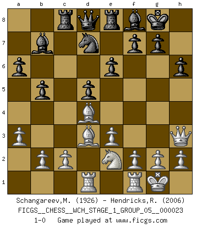 Last move : 1-0 2020 December 23 11:23:49 [Event "FICGS__CHESS__WCH_STAGE_1_GROUP_05__000023"] [Site "FICGS"] [Date "2020.11.05"] [Round "1"] [White "Schangareev,Mirzian"] [Black "Hendricks,Richard"] [Result "1-0"] [WhiteElo "1926"] [BlackElo "2006"] 1.Nc3 d5 2.d4 Nf6 3.Bf4 a6 4.Nf3 e6 5.e3 c5 6.dxc5 Bxc5 7.Bd3 Nbd7 8.O-O b5 9.Ne5 Bb7 10.Qf3 O-O 11.Rad1 Re8 12.Qh3 h6 13.a3 Bf8 14.Ne2 Rc8 15.Bg3 Nxe5 16.Bxe5 Nd7 17.Bd4 1-0 This chess game has been lost on time (started : 2020.11.05 12:58:26) Dunst (Sleipner, Heinrichsen) Opening Kingside Castling by player White (move 8) Kingside Castling by player Black (move 10) Player White won this chess game. Follow this game move after move (download)As one by one I mowed them down, my superiority soon became apparent. (Jose Capablanca) Ein Buch ist ein Spiegel; wenn ein Affe hineinsieht, so kann kein Apostel heraus gucken. (Georg Christoph Lichtenberg) Un jugador que es sorprendido, esta derrotado a medias. (Proverbio) Le succès, c'est être capable d'aller d'échec en échec sans perdre son enthousiasme. (Winston Churchill) Tomorrow's what you make of it. (Horatio Caine, C.S.I. Miami)