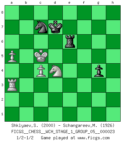Last move : 1/2-1/2 2020 November 16 19:29:27 [Event "FICGS__CHESS__WCH_STAGE_1_GROUP_05__000023"] [Site "FICGS"] [Date "2020.11.05"] [Round "1"] [White "Shklyaev,Sergei"] [Black "Schangareev,Mirzian"] [Result "1/2-1/2"] [WhiteElo "2000"] [BlackElo "1926"] 1.e4 e5 2.Nf3 Nc6 3.Bb5 a6 4.Bxc6 dxc6 5.O-O f6 6.d4 exd4 7.Nxd4 c5 8.Nb3 Qxd1 9.Rxd1 Bd6 10.Na5 b6 11.Nc4 Be7 12.Bf4 Bd8 13.Nc3 Ne7 14.b3 Be6 15.Nd5 Bxd5 16.exd5 O-O 17.Bxc7 Bxc7 18.d6 Bxd6 19.Rxd6 b5 20.Ne3 Kf7 21.g3 Rfc8 22.h4 Ra7 23.h5 c4 24.bxc4 Rc5 25.g4 f5 26.f4 fxg4 27.Nxg4 Rxh5 28.Ne5+ Ke8 29.Rb6 Rc7 30.Rxa6 bxc4 31.Re1 Rf5 32.a4 Kd8 33.Rd1+ Ke8 34.Rad6 Ng6 35.Re6+ Re7 36.Rxe7+ Nxe7 37.a5 Rf6 38.Ra1 Ra6 39.Kf2 c3 40.Kf3 h5 41.Ra3 Nd5 42.Ke4 Nf6+ 43.Kd4 h4 44.Kxc3 Nd5+ 45.Kc4 Nxf4 46.Kb5 Re6 47.Nf3 Nd5 48.Nxh4 Nc7+ 49.Kc5 Kd7 50.c4 g5 51.Nf3 g4 52.Nd4 Na6+ 53.Kb5 Nc7+ 54.Kc5 Na6+ 55.Kb5 Nc7+ 56.Kc5 1/2-1/2 Ruy Lopez : Exchange, Gligoric variation Kingside Castling by player White (move 5) Kingside Castling by player Black (move 16) 10 pieces endgame at move 45 : White KRNPP , Black KRNPP WHITE : King + 1 Rook 1 Knight 2 Pawns BLACK : King + 1 Rook 1 Knight 2 Pawns 9 pieces endgame at move 48 : White KRNPP , Black KRNP WHITE : King + 1 Rook 1 Knight 2 Pawns BLACK : King + 1 Rook 1 Knight 1 Pawn This chess game ended in a draw. Follow this game move after move (download)The beauty of a move lies not in its' appearance but in the thought behind it. (Siegbert Tarrasch) Ich spiele 70 Eröffnungssysteme. (Viktor Kortschnoi) ¿Esta Bobby Fischer algo cuerdo?. (Salo Flohr) Le jeu d'échecs est comme rejeté hors du temps. (Antoine de Saint-Exupéry) When you stop learning you start dying. (Scott Adams)