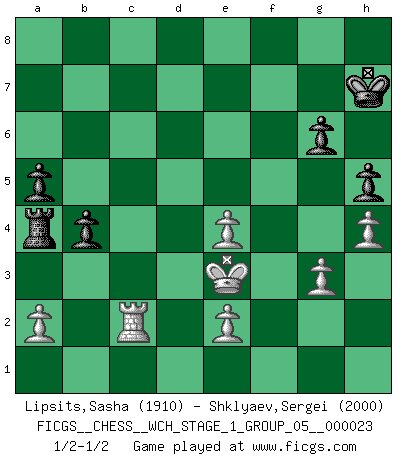 Last move : 1/2-1/2 2021 January 31 5:46:12 [Event "FICGS__CHESS__WCH_STAGE_1_GROUP_05__000023"] [Site "FICGS"] [Date "2020.11.05"] [Round "1"] [White "Lipsits,Sasha"] [Black "Shklyaev,Sergei"] [Result "1/2-1/2"] [WhiteElo "1910"] [BlackElo "2000"] 1.d4 Nf6 2.c4 e6 3.Nc3 d5 4.Nf3 c5 5.cxd5 exd5 6.g3 Nc6 7.Bg2 cxd4 8.Nxd4 Bc5 9.Nb3 Bb4 10.O-O Bxc3 11.bxc3 O-O 12.Bg5 Be6 13.Nc5 Rc8 14.Rc1 h6 15.Bxf6 Qxf6 16.Nxe6 fxe6 17.c4 d4 18.c5 Rc7 19.Qc2 Kh8 20.Rb1 e5 21.Bd5 Qe7 22.Qg6 Rf6 23.Qe4 Qxc5 24.Rfc1 Qf8 25.f3 d3 26.Qxd3 Nb4 27.Qe4 Nxd5 28.Qxd5 Qd6 29.Rd1 Qxd5 30.Rxd5 Ra6 31.Rb2 Re7 32.h4 g6 33.Rdb5 b6 34.Rc2 h5 35.Rd5 Kh7 36.Kg2 Ra4 37.Kf2 Kg7 38.Rc6 Kh7 39.R5d6 Rg7 40.Rc2 Re7 41.Rf6 b5 42.Rfc6 a5 43.Ke3 b4 44.R6c4 e4 45.Rxe4 Rxe4+ 46.fxe4 1/2-1/2 Queen's pawn game Kingside Castling by player White (move 10) Kingside Castling by player Black (move 11) This chess game ended in a draw. Follow this game move after move (download)All Chess players should have a hobby. (Savielly Tartakower) Wie bekannt hörte Morphy 1859 auf, Schach zu spielen. Seine Enttäuschung galt nicht so sehr dem Schach, wie den Schachspielern. (Robert James Fischer) Siempre es mucho mejor sacrificar las piezas de tu oponente. (Savielly Tartakover) Votre seul travail dans les ouvertures est d'obtenir un milieu de partie jouable. (Lajos Portish) There are two major products that came out of Berkeley: LSD and UNIX. We do not believe this is to be a coincidence. (Jeremy S. Anderson)