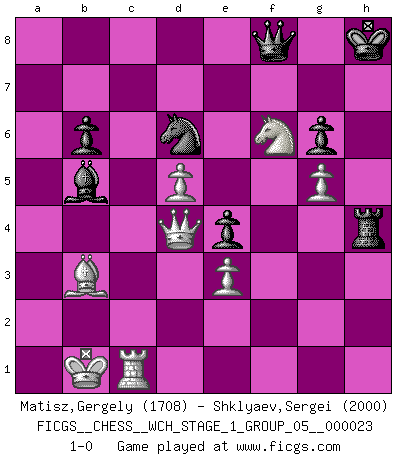 Last move : 1-0 2021 April 1 16:0:27 [Event "FICGS__CHESS__WCH_STAGE_1_GROUP_05__000023"] [Site "FICGS"] [Date "2020.11.05"] [Round "1"] [White "Matisz,Gergely"] [Black "Shklyaev,Sergei"] [Result "1-0"] [WhiteElo "1708"] [BlackElo "2000"] 1.b3 e5 2.Bb2 Nc6 3.e3 Nf6 4.Bb5 Bd6 5.Be2 O-O 6.c4 Re8 7.a3 b6 8.d3 Bb7 9.h4 e4 10.d4 Bf8 11.Nh3 d5 12.g4 Ne7 13.Nf4 Ng6 14.Nxg6 hxg6 15.Nc3 c6 16.g5 Nh7 17.Qc2 Bc8 18.O-O-O Bf5 19.b4 a5 20.b5 cxb5 21.Nxb5 Qd7 22.Kb1 a4 23.cxd5 Rec8 24.Bc3 Qxd5 25.Qa2 Qd7 26.Rd2 Rd8 27.d5 Rac8 28.Bb4 Bxb4 29.axb4 Nf8 30.Bc4 Ne6 31.Ka1 Kh7 32.Rc1 a3 33.R1c2 Nc7 34.Na7 Ra8 35.Nc6 Rdc8 36.b5 Qd6 37.Be2 Ne8 38.Qc4 Rc7 39.h5 gxh5 40.Bxh5 g6 41.Bd1 Qf8 42.Rc1 Nd6 43.Qb4 f6 44.f4 fxg5 45.Rh2+ Kg8 46.fxg5 a2 47.Rxa2 Rxa2+ 48.Kxa2 Rh7 49.Bb3 Rh2+ 50.Kb1 Bd7 51.Ne5 Bxb5 52.Ng4 Rh4 53.Nf6+ Kh8 54.Qd4 1-0 This chess game has been lost on time (started : 2020.11.05 12:58:26) Nimzovich-Larsen attack : Modern variation Kingside Castling by player Black (move 5) Queenside Castling by player White (move 18) Player White won this chess game. Follow this game move after move (download)In complicated positions, Bobby Fischer hardly had to be afraid of anybody. (Paul Keres) Je mehr ich von der FIDE weiss, um so weniger verstehe ich. (Alexander Kalifman) El Ajedrez es una manera fabulosa para que los niños aprendan a autovalorarse y a autoestimarse. (Saudin Robovic) Aux échecs, les retours au sommet sont rares : les dommages psychologiques consécutifs à une défaite sont trop sévères. (Daily Telegraph) All politicians must be presumed guilty until they are proven innocent. (Dinesh De Silva)