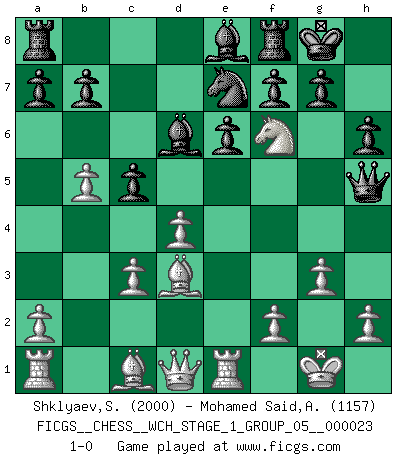 Last move : 1-0 2020 November 11 18:41:29 [Event "FICGS__CHESS__WCH_STAGE_1_GROUP_05__000023"] [Site "FICGS"] [Date "2020.11.05"] [Round "1"] [White "Shklyaev,Sergei"] [Black "Mohamed Said,Azaim"] [Result "1-0"] [WhiteElo "2000"] [BlackElo "1157"] 1.e4 e6 2.d4 d5 3.Nc3 dxe4 4.Nxe4 Nf6 5.Nxf6+ Qxf6 6.Nf3 Nc6 7.Bd3 h6 8.c3 Bd7 9.b4 Bd6 10.b5 Ne7 11.O-O O-O 12.Re1 c5 13.Ne5 Be8 14.Ng4 Qh4 15.g3 Qh5 16.Nf6+ 1-0 French : Rubinstein variation Kingside Castling by player White (move 11) Kingside Castling by player Black (move 11) Player White won this chess game. Follow this game move after move (download)I prefer to lose a really good game than to win a bad one. (David Levy) Schach ist ein schwarz-weisser Dschungel. (Garry Kasparov) El Ajedrez es sobre todo, ¡una pelea!. (Emanuel Lasker) Un journaliste : 'Vous préférez avoir une dame de plus sur l'échiquier ou au lit ?' Boris Spassky : 'Ca dépend de la position.' Tree pose grows confidence. It roots me to this world. (Terri Guillemets)