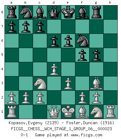 Last move : 0-1 2020 December 18 1:12:2 [Event "FICGS__CHESS__WCH_STAGE_1_GROUP_06__000023"] [Site "FICGS"] [Date "2020.11.05"] [Round "1"] [White "Kopasov,Evgeny"] [Black "Foster,Duncan"] [Result "0-1"] [WhiteElo "2139"] [BlackElo "1916"] 1.d4 f5 2.Bg5 h6 3.Bh4 g5 4.Bg3 Nf6 5.e3 d6 6.h4 Rg8 7.hxg5 hxg5 8.Nc3 e6 0-1 This chess game has been lost on time (started : 2020.11.05 12:58:28) Dutch, 2.Bg5 variation Player Black won this chess game. Follow this game move after move (download)What is the difference between chess and football? Everybody understands football, but nobody plays it. Everybody plays chess, but nobody understands it. Everything is relative. (Vladimir Kramnik) Wenn Capablanka heute auf der Schachbühne erscheinen würde, hätte er ein halbes Jahr gebraucht um sich die Schachtheorie anzueignen. Und dann hätte er alles und jeden besiegt. (Mikhail Moiseyevich Botvinik) La vida es como un juego de Ajedrez, cambiando con cada movimiento. (Proverbio Chino) Roi des jeux et jeu des rois, les échecs portent en eux un sentiment d'infini. Ils donnent à celui qui s'est efforcé d'en approfondir les arcanes l'impression de n'être pas à la mesure de l'homme; en fait, ils constituent un résumé de l'univers, un microcosme, et figurent cette grande échelle qui, dans les plans de la lumière descend jusqu'à la matière, qui des abîmes insondables remonte jusqu'en l'infini de Dieu. (Pyrame) Is not life a hundred times too short to bore ourselves ? (Friedrich Nietzsche)
