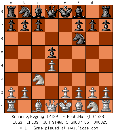 Last move : 0-1 2020 December 26 2:10:4 [Event "FICGS__CHESS__WCH_STAGE_1_GROUP_06__000023"] [Site "FICGS"] [Date "2020.11.05"] [Round "1"] [White "Kopasov,Evgeny"] [Black "Pech,Matej"] [Result "0-1"] [WhiteElo "2139"] [BlackElo "1728"] 1.d4 d5 2.c4 e6 3.Nc3 Nf6 4.cxd5 exd5 0-1 This chess game has been lost on time (started : 2020.11.05 12:58:28) QGD : Exchange variation Player Black won this chess game. Follow this game move after move (download)A strong memory, concentration, imagination, and a strong will is required to become a great Chess player. (Bobby Fischer) Ja, jede Frau in Holland liebt mich bestimmt, und alle Männer hassen mich. (Loek van Wely) El ganar no lo es todo... pero el perder es nada. (Mednis) Le thème de l'attaque double intervient d'une manière ou d'une autre dans l'immense majorité des combinaisons. (Youri Averbakh) Those parts of the system that you can hit with a hammer (not advised) are called hardware; those program instructions that you can only curse at are called software. (Anonymous)
