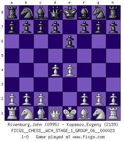 Last move : 1-0 2020 December 25 0:5:22 [Event "FICGS__CHESS__WCH_STAGE_1_GROUP_06__000023"] [Site "FICGS"] [Date "2020.11.05"] [Round "1"] [White "Rivenburg,John"] [Black "Kopasov,Evgeny"] [Result "1-0"] [WhiteElo "0995"] [BlackElo "2139"] 1.e4 e6 2.d4 1-0 This chess game has been lost on time (started : 2020.11.05 12:58:28) French defense Player White won this chess game. Follow this game move after move (download)It's just you and your opponent at the board and you're trying to prove something. (Bobby Fischer) Ich war schon mal beim Dopingtest. Da musste ich Urin abgeben, während Dritte zusahen. (Elisabeth Pähtz) El Ajedrez detiene a su maestro dentro de sus propios vínculos, encadenando la mente y el cerebro, por lo que la libertad interior del mas fuerte debe sufrir. (Albert Einstein) Il s'avisa de me proposer d'apprendre les échecs qu'il jouait un peu... me voilà forcené des échecs. J'achète un échiquier, je m'enferme dans ma chambre, j'y passe des jours et des nuits à vouloir apprendre par cur toutes les parties. (Jean-Jacques Rousseau, Confessions) Who needs drugs and alcohol if he can play Big Chess at FICGS ? (Heinz-Georg Lehnhoff)
