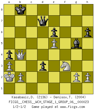 Last move : 1/2-1/2 2020 December 19 12:47:53 [Event "FICGS__CHESS__WCH_STAGE_1_GROUP_06__000023"] [Site "FICGS"] [Date "2020.11.05"] [Round "1"] [White "Kasabasic,Djordje"] [Black "Denisov,Timofey"] [Result "1/2-1/2"] [WhiteElo "2136"] [BlackElo "2004"] 1.e4 c5 2.Nf3 d6 3.d4 cxd4 4.Nxd4 Nf6 5.Nc3 a6 6.Bg5 Nbd7 7.f4 Qc7 8.Qf3 b5 9.O-O-O Bb7 10.Bd3 e6 11.Rhe1 Qb6 12.Bxf6 Nxf6 13.f5 O-O-O 14.Nb3 b4 15.Nb1 d5 16.N1d2 Kb8 17.Qg3+ Ka8 18.e5 Nd7 19.Nf3 h6 20.fxe6 fxe6 21.Qg4 a5 22.Nbd4 Nc5 23.Qg6 Nxd3+ 24.Rxd3 Bc8 25.Kb1 a4 26.Rc1 Bc5 27.c3 bxc3 28.R1xc3 Rhf8 29.a3 Bd7 30.Rd2 Rf4 31.Ne2 Re4 32.Rdc2 Be3 33.Rc7 Bb5 34.Rc8+ Rxc8 35.Rxc8+ Kb7 36.Rg8 Ka6 37.Ra8+ Kb7 38.Rg8 Qc6 39.Nc3 Rc4 40.Rxg7+ Kb6 41.Qd3 d4 42.Nxb5 Qxb5 43.Ka2 Qd5 44.Rd7 Qxd7 45.Qxc4 d3 46.Qe4 Bg5 47.Qb4+ Ka6 48.Qc4+ Ka7 49.Qc5+ Kb8 50.Qb4+ 1/2-1/2 Sicilian : Najdorf, 6.Bg5 Queenside Castling by player White (move 9) Queenside Castling by player Black (move 13) This chess game ended in a draw. Follow this game move after move (download)Chess is a terrible game. If you have no center, your opponent has a freer position. If you do have a center, then you really have something to worry about ! (Siegbert Tarrasch) Die meiste Zeit treffe ich auf Gegner, die meine Enkel sein könnten. Ich bin da, um ihnen zu zeigen, dass sie von mir noch einiges lernen können. (Viktor Kortschnoi) Vive, pierde y aprende al observar a tu oponente como ganar. (Amber Steenbock) Les échecs c'est le défi de l'alpiniste, toujours plus haut, prêt à tout pour monter à l'assaut du Roi ennemi. Les échecs, c'est de la musique en mouvement, un ballet majestueux pour les yeux. C'est de la poésie composée par les fantômes du passé qui au même titre que Rimbaud ou Verlaine méritent notre admiration. Les échecs, c'est de la peinture ou le moindre mouvement modifie le tableau pour en faire un Picasso ou un Van Gogh. Les échecs, c'est tout et rien, c'est la vie et la mort. Jjulie33 sur le forum de France-Echecs. To err is human, to shift the blame on someone else is tactical. (Mladen Jankovic)