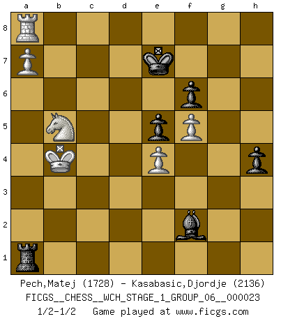 Last move : 1/2-1/2 2021 April 30 23:15:28 [Event "FICGS__CHESS__WCH_STAGE_1_GROUP_06__000023"] [Site "FICGS"] [Date "2020.11.05"] [Round "1"] [White "Pech,Matej"] [Black "Kasabasic,Djordje"] [Result "1/2-1/2"] [WhiteElo "1728"] [BlackElo "2136"] 1.e4 c5 2.Nf3 Nc6 3.d4 cxd4 4.Nxd4 Nf6 5.Nc3 d6 6.Bg5 e6 7.Qd2 a6 8.O-O-O Bd7 9.f3 Nxd4 10.Qxd4 Be7 11.h4 Qc7 12.Kb1 b5 13.g4 O-O 14.Bxf6 Bxf6 15.Qxd6 Qxd6 16.Rxd6 Ra7 17.g5 Be7 18.Rd3 b4 19.Ne2 h6 20.gxh6 gxh6 21.Nd4 Kh8 22.f4 Rg8 23.Bh3 Bxh4 24.f5 e5 25.Nf3 Bg3 26.Rd6 Bf4 27.Bf1 Bb5 28.Rb6 Kh7 29.Bxb5 axb5 30.Rxb5 Rga8 31.a3 bxa3 32.b3 a2+ 33.Ka1 Rd7 34.Rc5 f6 35.b4 Ra3 36.c3 Rda7 37.Rd1 Rb3 38.Ra5 Rxa5 39.bxa5 Rxc3 40.a6 Be3 41.Kxa2 Rc6 42.Rd7+ Kg8 43.Rd8+ Kf7 44.Ra8 Bf2 45.Kb3 h5 46.Kb4 Rb6+ 47.Kc4 Rc6+ 48.Kb5 Rb6+ 49.Ka5 Rb3 50.Nd2 Rb2 51.Nc4 Rb1 52.Nd6+ Ke7 53.Nb5 h4 54.a7 Ra1+ 55.Kb4 1/2-1/2 Sicilian defense Queenside Castling by player White (move 8) Kingside Castling by player Black (move 13) This chess game ended in a draw. Follow this game move after move (download)Chess is above all, a fight ! (Emanuel Lasker) Wenn Spassky eine Figur opfert kannst du genauso gut aufgeben. Aber wenn Tal eine Figur opfert, spiel weiter. Er könnte noch eine weitere opfern, und dann ... wer weiß? (Miguel Najdorf) Todavía soy una víctima del Ajedrez. Tiene toda la belleza del arte y mucho mas. No puede ser comercializado. El Ajedrez es mas puro que el arte en su posición social. (Marcel Duchamp) Les Cavaliers se révèlent fort utiles dans les positions fermées. D'habitude, les Fous sont un peu plus forts que les Cavaliers dans les positions ouvertes. Qu'on le veuille ou non, il restera toujours des exceptions ! You lose, general Kenobi. (General Grievous in Star Wars ep.3)