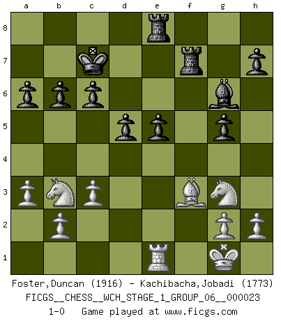 Last move : 1-0 2021 March 30 21:3:29 [Event "FICGS__CHESS__WCH_STAGE_1_GROUP_06__000023"] [Site "FICGS"] [Date "2020.11.05"] [Round "1"] [White "Foster,Duncan"] [Black "Kachibacha,Jobadi"] [Result "1-0"] [WhiteElo "1916"] [BlackElo "1773"] 1.e4 Nc6 2.d4 d5 3.e5 Nh6 4.Bxh6 gxh6 5.c3 Rg8 6.Ne2 Bg4 7.f3 Bf5 8.Ng3 Bg6 9.Nd2 e6 10.Nb3 a6 11.f4 Qh4 12.Qd2 f6 13.Be2 O-O-O 14.O-O Be7 15.Qe3 fxe5 16.dxe5 Rdf8 17.Rf2 Rf7 18.Nd2 Kb8 19.Raf1 Rgf8 20.a3 Nxe5 21.Qxe5 Bc5 22.Nb3 Bxf2+ 23.Rxf2 Rxf4 24.Bf3 Qg5 25.Re2 Re8 26.Qe3 Rf7 27.Qxg5 hxg5 28.Rf2 c6 29.Re2 Kc7 30.Nd4 e5 31.Nb3 b6 32.Re1 1-0 KP : Nimzovich defense Queenside Castling by player Black (move 13) Kingside Castling by player White (move 14) Player White won this chess game. Follow this game move after move (download)Fischer wanted to give the Russians a taste of their own medicine. (Larry Evans) Schach ist eine Sache der genauen Beurteilung, wann man zuschlagen und wann man sich ducken muss. (Robert James Fischer) El Ajedrez, como la música, como el amor, tiene el poder de hacer feliz a la gente. (Siegbert Tarrasch) La tactique, c'est ce que vous faites quand il y a quelque chose à faire; la stratégie, c'est ce que vous faites quand il n'y a rien à faire. (Savielli Tartacower) A shortcut is the longest distance between two points. (Don Groves)