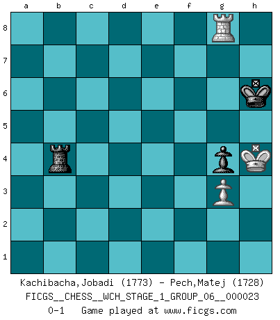 Last move : 0-1 2021 June 25 3:5:36 [Event "FICGS__CHESS__WCH_STAGE_1_GROUP_06__000023"] [Site "FICGS"] [Date "2020.11.05"] [Round "1"] [White "Kachibacha,Jobadi"] [Black "Pech,Matej"] [Result "0-1"] [WhiteElo "1773"] [BlackElo "1728"] 1.e4 e5 2.Nf3 Nc6 3.Bc4 Bc5 4.O-O Nf6 5.d3 d6 6.c3 a6 7.a4 Ba7 8.Re1 O-O 9.h3 h6 10.Nbd2 Ne7 11.Nf1 Ng6 12.Ng3 c6 13.Bb3 d5 14.exd5 Nxd5 15.d4 exd4 16.Nxd4 Re8 17.Rxe8+ Qxe8 18.Bxd5 cxd5 19.Be3 Bb8 20.Ndf5 Bxf5 21.Nxf5 Qe5 22.Ng3 Qe6 23.Nh5 Be5 24.Qd2 Qf5 25.Ng3 Bxg3 26.fxg3 Re8 27.Rd1 Re4 28.b4 Qe6 29.Bc5 Re5 30.b5 axb5 31.axb5 Nf8 32.Qa2 Qd7 33.c4 Ne6 34.Bf2 d4 35.Qa8+ Kh7 36.Qa3 f5 37.Qf3 Kg8 38.Kh2 Kh8 39.Rd2 Kg8 40.Kg1 Rc5 41.Qd3 Qf7 42.Kh2 Rc8 43.Bxd4 Nxd4 44.Qxd4 Qxc4 45.Qxc4+ Rxc4 46.Rd7 b6 47.Rb7 Rb4 48.Rxb6 Rb1 49.h4 Kf7 50.g4 fxg4 51.Kg3 Rb4 52.h5 Ke7 53.Rb7+ Kf6 54.Kh4 Rb2 55.g3 Rb4 56.b6 g5+ 57.hxg6 Kxg6 58.Rb8 h5 59.b7 Rb1 60.Rg8+ Kh6 61.Rh8+ Kg6 62.Rxh5 Rxb7 63.Rg5+ Kh6 64.Rg8 Rb4 0-1 Giuoco Piano Kingside Castling by player White (move 4) Kingside Castling by player Black (move 8) 10 pieces endgame at move 50 : White KRPPP , Black KRPPP WHITE : King + 1 Rook 3 Pawns BLACK : King + 1 Rook 3 Pawns 9 pieces endgame at move 57 : White KRPPP , Black KRPP WHITE : King + 1 Rook 3 Pawns BLACK : King + 1 Rook 2 Pawns 8 pieces endgame at move 57 : White KRPP , Black KRPP WHITE : King + 1 Rook 2 Pawns BLACK : King + 1 Rook 2 Pawns 7 pieces endgame at move 62 : White KRPP , Black KRP WHITE : King + 1 Rook 2 Pawns BLACK : King + 1 Rook 1 Pawn 6 pieces endgame at move 62 : White KRP , Black KRP WHITE : King + 1 Rook 1 Pawn BLACK : King + 1 Rook 1 Pawn Player Black won this chess game. Follow this game move after move (download)Up to this point White has been following well-known analysis. But now he makes a fatal error: he begins to use his own head. (Siegbert Tarrasch) Das Schachspiel hat wie die Liebe, die Musik, die Fähigkeit, den Menschen glücklich zu machen. Ich habe ein leises Gefühl des Bedauerns für jeden, der das Schachspiel nicht kennt, so wie ich jeden bedaure, der die Liebe nicht kennt. (Siegbert Tarrasch) Un mal día en el Ajedrez, es mejor que cualquier buen día en el trabajo. (Anonymous) On n'a jamais que l'âge auquel on a commence à jouer aux échecs car après on cesse de vieillir. (Capablanca) There will be no order, only chaos. (Sol Robeson in Pi by Darren Aronofsky)