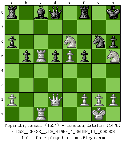 Last move : 1-0 2007 October 13 13:52:49 [Event "FICGS__CHESS__WCH_STAGE_1_GROUP_14__000003"] [Site "FICGS"] [Date "2007.07.11"] [Round "1"] [White "Kepinski,Janusz"] [Black "Ionescu,Catalin"] [Result "1-0"] [WhiteElo "1624"] [BlackElo "1476"] 1.e4 c5 2.b4 cxb4 3.c3 bxc3 4.Nxc3 Nc6 5.Nf3 e6 6.Bb5 a6 7.Bxc6 dxc6 8.O-O Bd6 9.d4 Ne7 10.Ne2 O-O 11.Bf4 Ng6 12.Bxd6 Qxd6 13.e5 Qd8 14.Qd2 b5 15.Rfc1 Bb7 16.Rc5 h6 17.Nc3 f5 18.Ne2 Ne7 19.Nf4 Bc8 20.d5 cxd5 21.Rac1 g5 22.Nh5 Kh8 23.Nxg5 Ng6 24.Nxe6 1-0 Sicilian : wing gambit Kingside Castling by player White (move 8) Kingside Castling by player Black (move 10) Player White won this chess game. Follow this game move after move (download)Chess is a terrible game. If you have no center, your opponent has a freer position. If you do have a center, then you really have something to worry about ! (Siegbert Tarrasch) Schach ist mein Leben, meine Leidenschaft, was ich gelernt habe und seit meinem 14. Lebensjahr profimässig praktiziere. Darauf zu verzichten, würde mir sehr schwer fallen. (Viktor Kortschnoi) Con el tiempo, empecé a progresar en partidas decisivas. Tal vez porque me di cuenta de una simple verdad: no solo estaba yo nervioso sino también mi oponente. (Mikhail Tal) Des points faibles ou des trous dans la position de l'adversaire doivent être occupés par des pièces et non pas par des pions. (Siegbert Tarrasch) As a goal marker shodan is important. As a destination it is a poor place to stop. (Thomas Tamayo)