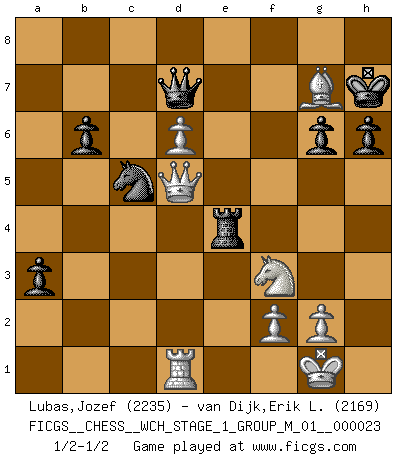 Last move : 1/2-1/2 2021 February 1 3:31:17 [Event "FICGS__CHESS__WCH_STAGE_1_GROUP_M_01__000023"] [Site "FICGS"] [Date "2020.11.05"] [Round "1"] [White "Lubas,Jozef"] [Black "van Dijk,Erik L."] [Result "1/2-1/2"] [WhiteElo "2235"] [BlackElo "2169"] 1.c4 Nf6 2.d4 g6 3.Nc3 d5 4.Nf3 Bg7 5.cxd5 Nxd5 6.e4 Nxc3 7.bxc3 c5 8.Rb1 O-O 9.Be2 cxd4 10.cxd4 Qa5+ 11.Bd2 Qxa2 12.O-O b6 13.Re1 Ba6 14.h4 Nc6 15.Be3 Rfd8 16.h5 Bxe2 17.Rxe2 Qa6 18.Rd2 Rac8 19.Bg5 Na5 20.Bxe7 Re8 21.Bg5 h6 22.hxg6 fxg6 23.Bh4 Rxe4 24.d5 Qb7 25.d6 Qd7 26.Bg3 Nb7 27.Rd5 Rc5 28.Qd2 Kh7 29.Rd1 a5 30.Rxc5 Nxc5 31.Qd5 a4 32.Be5 a3 33.Bxg7 1/2-1/2 English, 1...Nf6 (Anglo-Indian defense) Kingside Castling by player Black (move 8) Kingside Castling by player White (move 12) This chess game ended in a draw. Follow this game move after move (download)Examine moves that smite! A good eye for smites is far more important than a knowledge of strategical principles. (Purdy) Privat ist Kortschnoi kein schlechter Mensch, sehr sympathisch. Aber während des Spiels ist er grausam. Er will dich töten. (Miguel Najdorf) Una compensación adecuada por un sacrificio es tener una combinación sólida que conduce a una posición ganadora; una compensación adecuada por una metida de pata es dejar a tu oponente arrebatar una derrota de las fauces de la victoria. (Bruce A. Moon) Les échecs, c'est l'art d'analyser. (Mikhail Botvinnik) It is not enough to be a good player... you must also play well. (Siegbert Tarrasch)