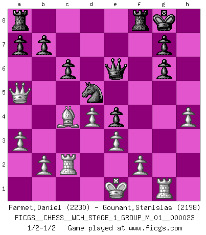 Last move : 1/2-1/2 2020 November 16 16:26:46 [Event "FICGS__CHESS__WCH_STAGE_1_GROUP_M_01__000023"] [Site "FICGS"] [Date "2020.11.05"] [Round "1"] [White "Parmet,Daniel"] [Black "Gounant,Stanislas"] [Result "1/2-1/2"] [WhiteElo "2230"] [BlackElo "2198"] 1.d4 d5 2.Nf3 Nf6 3.c4 c6 4.e3 Bg4 5.h3 Bh5 6.g4 Bg6 7.Ne5 e6 8.Nc3 Nbd7 9.Nxg6 hxg6 10.cxd5 exd5 11.g5 Ne4 12.Nxe4 dxe4 13.h4 Bb4+ 14.Bd2 Bxd2+ 15.Qxd2 Qe7 16.Qa5 Nb6 17.Rc1 O-O 18.a3 f5 19.gxf6 Qxf6 20.Rc2 Nd5 21.Bc4 Qe6 22.Rg1 1/2-1/2 Queen's pawn game Kingside Castling by player Black (move 17) This chess game ended in a draw. Follow this game move after move (download)In Chess, just as in life, today's bliss may be tomorrow's poison. (Assaic) Verschiedene, sehr schätzbare und im Laufe des Lebens nützliche Eigenschaften des Geistes können durch das Schachspiel erworben und gekräftigt werden, so dass sie zu Gewohnheiten werden, die uns nie im Stich lassen. (Benjamin Franklin) Combinaciones deslumbrantes son para la mayoría, mover madera es para los pocos. (Georg Kieninger) Toutes choses étant égales, c'est la conviction qui gagne. Alliée à une volonté de vaincre, elle sert de détonateur, suscite des idées, disperse les doutes et aide à penser clairement. (Robert Fischer) May the force be with you. (Han Solo in Star Wars ep.4)