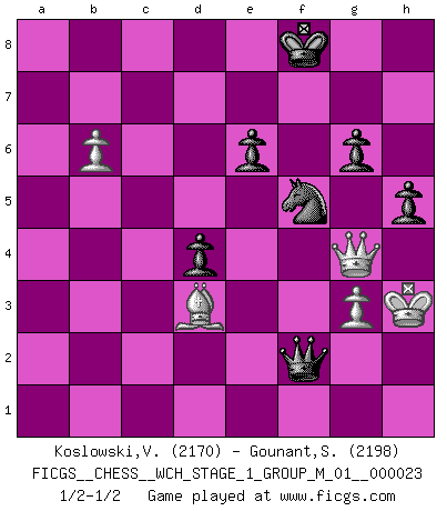Last move : 1/2-1/2 2021 February 27 8:53:26 [Event "FICGS__CHESS__WCH_STAGE_1_GROUP_M_01__000023"] [Site "FICGS"] [Date "2020.11.05"] [Round "1"] [White "Koslowski,Volker"] [Black "Gounant,Stanislas"] [Result "1/2-1/2"] [WhiteElo "2170"] [BlackElo "2198"] 1.e4 c6 2.d4 d5 3.e5 c5 4.Nf3 cxd4 5.Nxd4 Nc6 6.Nxc6 bxc6 7.Bd3 e6 8.O-O Ne7 9.Nd2 Nf5 10.Re1 a5 11.Nf3 Be7 12.c3 O-O 13.Qe2 Rb8 14.b3 c5 15.Bd2 Rb6 16.c4 Rb7 17.Bf4 d4 18.Rab1 Ra7 19.Nd2 Bb7 20.Ne4 Bc6 21.a3 Ba8 22.g3 h6 23.Rb2 Rb7 24.Reb1 Rb6 25.Bd2 Ra6 26.h4 Qc7 27.h5 Kh8 28.Bf4 Qb7 29.Kh2 g5 30.hxg6 fxg6 31.Bd2 Qc7 32.b4 cxb4 33.axb4 axb4 34.Bxb4 Bxb4 35.Rxb4 Ra5 36.Rb5 Rxb5 37.Rxb5 Bc6 38.Nf6 Bxb5 39.cxb5 Kg7 40.Qg4 Qxe5 41.Nd7 Qe1 42.Nxf8 Qxf2+ 43.Kh3 Kxf8 44.b6 h5 1/2-1/2 Caro-Kann : Advance variation Kingside Castling by player White (move 8) Kingside Castling by player Black (move 12) This chess game ended in a draw. Follow this game move after move (download)Whoever sees no other aim in the game than that of giving checkmate to one's opponent will never become a good Chess player. (Euwe) Wer sich die Fähigkeit anerziehen will im Schach selbstständig zu denken, der muß alles meiden, was leblos ist: ausgeklügelte Theorien, die sich auf sehr wenige Beispiele und eine Menge Hirngespinste stützen. (Emanuel Lasker) No es tiempo de jugar al Ajedrez cuando la casa esta en llamas. (Proverbio Italiano) La solitude du joueur d'Echecs à l'approche du mat est semblable à celle du condamné. (Francis Szpiner) For to win one hundred victories in one hundred battles is not the acme of skill. To subdue the enemy without fighting is the acme of skill. (Sun Tzu)