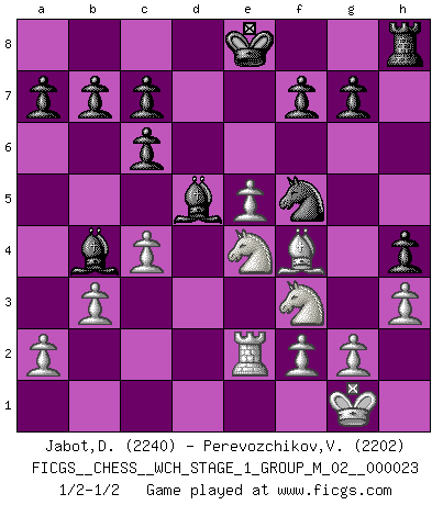 Last move : 1/2-1/2 2020 December 9 10:12:28 [Event "FICGS__CHESS__WCH_STAGE_1_GROUP_M_02__000023"] [Site "FICGS"] [Date "2020.11.05"] [Round "1"] [White "Jabot,Daniel"] [Black "Perevozchikov,Vjacheslav"] [Result "1/2-1/2"] [WhiteElo "2240"] [BlackElo "2202"] 1.e4 e5 2.Nf3 Nc6 3.Bb5 Nf6 4.O-O Nxe4 5.d4 Nd6 6.Bxc6 dxc6 7.dxe5 Nf5 8.Qxd8+ Kxd8 9.h3 h5 10.Nc3 Ke8 11.Bf4 Be6 12.Ne4 Be7 13.Rad1 Rd8 14.Nfg5 Rxd1 15.Rxd1 Bc8 16.Nf3 Be6 17.b3 Bd5 18.Re1 Bb4 19.Re2 h4 20.c4 1/2-1/2 Ruy Lopez : Berlin defense, Open variation Kingside Castling by player White (move 4) This chess game ended in a draw. Follow this game move after move (download)I guess a certain amount of temperament is expected of Chess geniuses. (Ron Gross) Gewöhnliche Menschen denken nur daran, wie sie ihre Zeit verbringen. Ein intelligenter Mensch versucht, sie auszunutzen. (Arthur Schopenhauer) En un gambito tu regalas un Peón por el bién de tomar un juego perdido. (Samuel Standige Boden) Le jeu d'échecs fait naître et fortifie en nous plusieurs qualités précieuses dans le cours de l'existence, telles que la prévoyance, la circonspection, la prudence, et la persévérance. (Benjamin Franklin - 1783, la morale des échecs) Excelling at chess has long been considered a symbol of more general intelligence. That is an incorrect assumption in my view, as pleasant as it might be. But for the purposes of argument and investigation, chess is, in Russkin-Gutman's words, 'an unparalleled laboratory, since both the learning process and the degree of ability obtained can be objectified and quantified, providing an excellent comparative framework on which to use rigorous analytical techniques.' (The Chess Master and the Computer, by Garry Kasparov - 2010)