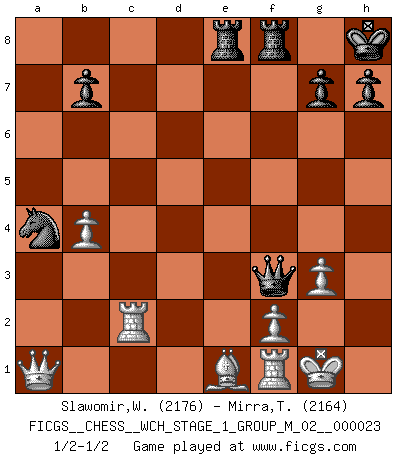 Last move : 1/2-1/2 2020 November 15 17:32:37 [Event "FICGS__CHESS__WCH_STAGE_1_GROUP_M_02__000023"] [Site "FICGS"] [Date "2020.11.05"] [Round "1"] [White "Slawomir,Weglicki"] [Black "Mirra,Theodore"] [Result "1/2-1/2"] [WhiteElo "2176"] [BlackElo "2164"] 1.c4 e5 2.g3 Nf6 3.Bg2 d5 4.cxd5 Nxd5 5.Nf3 Nc6 6.O-O Nb6 7.Nc3 Be7 8.d3 O-O 9.a3 Be6 10.Be3 f5 11.Rc1 Kh8 12.Na4 Bd5 13.Nc5 f4 14.Bd2 Bxc5 15.Rxc5 Qd6 16.b4 a5 17.Rc1 axb4 18.axb4 Na4 19.Qc2 Bxf3 20.Bxf3 Nd4 21.Qxc7 Nxf3+ 22.exf3 Qxd3 23.Be1 Qd5 24.Rc2 Qxf3 25.Qxe5 fxg3 26.hxg3 Rae8 27.Qa1 1/2-1/2 English Opening Kingside Castling by player White (move 6) Kingside Castling by player Black (move 8) This chess game ended in a draw. Follow this game move after move (download)Winning isn't everything... but losing is nothing. (Mednis) Herr Iljumschinow ist ein etwas merkwürdiger Geschäftsmann: Er arbeitet zusammen mit Leuten wie Muammar al-Gaddafi; früher ist das Saddam Hussein gewesen. (Joel Lautier) Todos los Maestros de Ajedrez fueron un día unos principiantes. (Chernev) Le système Elo représente seulement une moyenne. Il est simplement un indicateur de votre stabilité. (Anatoli Karpov) Life is the sum of all your choices. (Albert Camus)