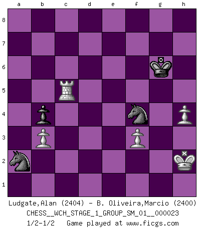 Last move : 1/2-1/2 2021 February 15 20:26:27 [Event "FICGS__CHESS__WCH_STAGE_1_GROUP_SM_01__000023"] [Site "FICGS"] [Date "2020.11.05"] [Round "1"] [White "Ludgate,Alan"] [Black "B. Oliveira,Marcio"] [Result "1/2-1/2"] [WhiteElo "2404"] [BlackElo "2400"] 1.d4 Nf6 2.c4 c5 3.d5 b5 4.Nf3 Bb7 5.e4 Nxe4 6.Bd3 Nd6 7.b3 e6 8.O-O Be7 9.Bf4 O-O 10.Re1 Ne8 11.Nc3 b4 12.Ne4 exd5 13.cxd5 d6 14.Nfg5 g6 15.Qg4 h5 16.Qh4 Nd7 17.g4 Bxg5 18.Bxg5 f6 19.gxh5 fxg5 20.Nxg5 Ng7 21.hxg6 Nf6 22.Nf7 Rxf7 23.gxf7+ Kxf7 24.Qh6 Bxd5 25.Re3 Ng8 26.Qg6+ Kf8 27.Be4 Bxe4 28.Qxe4 Ne8 29.Rae1 Nef6 30.Qf4 Rc8 31.Rd3 Qd7 32.Rxd6 Qg4+ 33.Qxg4 Nxg4 34.Red1 Ke7 35.Rd7+ Ke6 36.R1d6+ Ke5 37.Rd8 Rxd8 38.Rxd8 N8f6 39.Ra8 Ke4 40.Rxa7 Ne5 41.Rc7 Nd3 42.Rc8 Nd5 43.h4 N5f4 44.Re8+ Kf5 45.f3 Kg6 46.Kh2 Nc1 47.Re5 Nxa2 48.Rxc5 1/2-1/2 Benko gambit Kingside Castling by player White (move 8) Kingside Castling by player Black (move 9) 10 pieces endgame at move 47 : White KRPPP , Black KNNPP WHITE : King + 1 Rook 3 Pawns BLACK : King + 2 Knights 2 Pawns 9 pieces endgame at move 48 : White KRPPP , Black KNNP WHITE : King + 1 Rook 3 Pawns BLACK : King + 2 Knights 1 Pawn This chess game ended in a draw. Follow this game move after move (download)In Fischer's hands, a slight theoretical advantage is as good a being a Queen ahead. (Isaac Kashdan) Ich kenne keine einzige Person, die behaupten würde, Garri Kasparow sei ein guter Mensch (Nigel Short) Al jugar al Ajedrez entonces, podemos aprender: Primero: Previsión... Segundo: Prudencia... Tercero: Cautela... Y al final, aprendemos del Ajedrez el hábito de no ser desanimados por apariencias malas presentes en el estado de nuestros asuntos, el hábito de la esperanza por una oportunidad favorable y la perseveración de los secretos de los recursos. (Benjamin Franklin) Ce qui est bien, c'est d'avoir tout un tas de pièces en prise : l'adversaire ne peut en prendre qu'une à la fois. Cité par Thierry Audin. Creativity is inventing, experimenting, growing, taking risks, breaking rules, making mistakes, and having fun. (Mary Lou Cook)