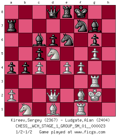 Last move : 1/2-1/2 2020 November 30 17:45:9 [Event "FICGS__CHESS__WCH_STAGE_1_GROUP_SM_01__000023"] [Site "FICGS"] [Date "2020.11.05"] [Round "1"] [White "Kireev,Sergey"] [Black "Ludgate,Alan"] [Result "1/2-1/2"] [WhiteElo "2367"] [BlackElo "2404"] 1.d4 Nf6 2.c4 g6 3.Nc3 Bg7 4.e4 d6 5.Nf3 O-O 6.Be2 e5 7.O-O exd4 8.Nxd4 Re8 9.f3 Nc6 10.Be3 Nh5 11.Nc2 Be5 12.g3 f5 13.Nd5 Bxb2 14.Rb1 Bg7 15.g4 f4 16.Bf2 Nf6 17.Nxf4 Nd7 18.h4 Nc5 19.Kg2 Rb8 20.Qd2 Ne6 21.Nd5 Ne5 22.f4 Nf7 23.Bf3 c6 24.Ndb4 Bd7 25.Rfd1 a6 26.Rb3 c5 27.Nd5 b5 28.Rdb1 Ra8 29.Na3 Bc6 30.g5 h6 31.Rf1 hxg5 32.hxg5 Rb8 33.Re1 Rb7 34.Bg4 b4 35.Nb1 a5 36.Rg3 a4 37.Bd1 Kf8 38.Rf1 Ra7 1/2-1/2 King's Indian : Orthodox variation Kingside Castling by player Black (move 5) Kingside Castling by player White (move 7) This chess game ended in a draw. Follow this game move after move (download)Methodical thinking is of more use in Chess than inspiration. (C. J. S. Purdy) Der Traum, für den ich lebe, ist der von einem freien Russland. Viele mögen sagen: Russland hat doch ein Parlament, einen gewählten Präsidenten. Aber ich spüre, dass in meiner Heimat die Angst wiederkehrt. Eine Angst, sich frei zu äußern, bestimmte Dinge zu tun (Garry Kasparov) En el Ajedrez, tal como en la vida, las bendiciones de hoy pueden ser el veneno del mañana. (Assaic) Je fais ceci parce que dans cinquante coups j'obtiendrai cela; je m'appelle Mikhail Moisevitch Botvinnik. (Botvinnik) The only difference between a tax man and a taxidermist is that the taxidermist leaves the skin. (Mark Twain)