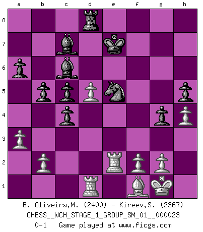 Last move : 0-1 2021 January 15 22:19:44 [Event "FICGS__CHESS__WCH_STAGE_1_GROUP_SM_01__000023"] [Site "FICGS"] [Date "2020.11.05"] [Round "1"] [White "B. Oliveira,Marcio"] [Black "Kireev,Sergey"] [Result "0-1"] [WhiteElo "2400"] [BlackElo "2367"] 1.Nf3 d5 2.c4 c6 3.d4 Nf6 4.Nc3 e6 5.Bg5 h6 6.Bh4 dxc4 7.e4 g5 8.Bg3 b5 9.Be2 Bb7 10.O-O Nbd7 11.Ne5 Bg7 12.Nxd7 Nxd7 13.Bd6 a6 14.Re1 Bf8 15.Bg3 Bb4 16.Bh5 Qe7 17.Qf3 O-O 18.Rad1 e5 19.dxe5 Bc8 20.a3 Ba5 21.e6 fxe6 22.Bd6 Qxd6 23.Rxd6 Rxf3 24.Bxf3 Ne5 25.Be2 Kf7 26.Rd2 Ke7 27.h3 c5 28.Rc1 Bb7 29.R2d1 Bc6 30.Rd2 Rf8 31.Ra1 h5 32.Bf1 g4 33.h4 Rg8 34.Rc2 Rd8 35.Re2 Bc7 36.Rd1 Nd3 37.Nd5+ exd5 38.exd5 Ne5 0-1 Reti Opening Kingside Castling by player White (move 10) Kingside Castling by player Black (move 17) Player Black won this chess game. Follow this game move after move (download)In life, as in Chess, one's own Pawns block one's way. A man's very wealth, ease, leisure, children, books, which should help him to win, more often checkmate him. (Charles Buxton) Im Internet Chess Club betrug mein Rating vorübergehend 3350 ELO-Punkte. (Sergej Karjakin) Alguna parte de un error es siempre correcto. (Savielly Tartakover) Je menace de comprendre la position. (Anonyme) I don't know, I don't care, and it doesn't make any difference. (Albert Einstein)