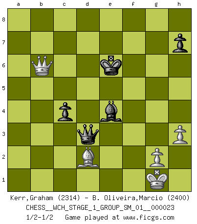 Last move : 1/2-1/2 2021 April 23 16:47:10 [Event "FICGS__CHESS__WCH_STAGE_1_GROUP_SM_01__000023"] [Site "FICGS"] [Date "2020.11.05"] [Round "1"] [White "Kerr,Graham"] [Black "B. Oliveira,Marcio"] [Result "1/2-1/2"] [WhiteElo "2314"] [BlackElo "2400"] 1.d4 Nf6 2.c4 c5 3.d5 b5 4.cxb5 a6 5.bxa6 e6 6.Nc3 exd5 7.Nxd5 Be7 8.Nxe7 Qxe7 9.e3 O-O 10.Bd3 Nc6 11.Ne2 Nb4 12.Bb1 d5 13.O-O Bxa6 14.a3 Nc6 15.Re1 Rfd8 16.Ng3 Qe5 17.f4 Qb8 18.h3 Bc4 19.Nf5 g6 20.Nh6+ Kf8 21.Qf3 Kg7 22.Ng4 Nxg4 23.Qxg4 Kg8 24.Bc2 Nb4 25.Qd1 d4 26.Be4 Ra6 27.b3 dxe3 28.Qf3 Bxb3 29.Rxe3 Bc2 30.Bb2 Nd3 31.Bc3 Qb3 32.Bd2 Qb2 33.Rf1 Rxa3 34.Qg3 c4 35.f5 Ra1 36.Rxa1 Qxa1+ 37.Kh2 Nf2 38.Qxf2 Qe5+ 39.Kg1 Bxe4 40.Qe1 gxf5 41.Bc3 Qe6 42.Rg3+ Kf8 43.Ba5 f4 44.Rg5 f6 45.Bxd8 fxg5 46.Bxg5 Kf7 47.Bxf4 Qd5 48.Qf2 Ke6 49.Bd2 Qd3 50.Qb6+ 1/2-1/2 Benko gambit accepted Kingside Castling by player Black (move 9) Kingside Castling by player White (move 13) 10 pieces endgame at move 47 : White KQBPP , Black KQBPP WHITE : King + 1 Queen 1 Bishop 2 Pawns BLACK : King + 1 Queen 1 Bishop 2 Pawns This chess game ended in a draw. Follow this game move after move (download)Chess teaches you to control the initial excitement you feel when you see something that looks good and it trains you to think objectively when you're in trouble. (Stanley Kubrick) Weshalb minderdergeübte Spieler mit g2-g4 beginnen? Die betreffenden sind unschlüssig, ob sie nun rechts (h4) oder links (f4) beginnen sollen, und in ihrer Ratlosigkeit entschliessen sie sich nach guter Bürgerart dazu, den goldenen Mittelweg zu wählen. (Aaron Nimzowitsch) Del Ajedrez se ha dicho que la vida no es lo suficientemente larga para él, pero eso es culpa de la vida, no del Ajedrez. (William Ewart Napier) L'action d'une oeuvre littéraire se déroule sur un champ de bataille. Les masques et les types du drame moderne correspondent aux pièces du jeu d'échecs. L'intrigue correspond aux coups et aux gambits, c'est à dire aux techniques du jeu telles qu'utilisées et interprétées par les joueurs. Les tactiques et les péripéties [mouvements] correspondent aux coups exécutés par l'adversaire. (Viktor Shklovsky) The beginning is the most important part of the work. (Plato)