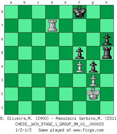 Last move : 1/2-1/2 2021 May 13 16:10:39 [Event "FICGS__CHESS__WCH_STAGE_1_GROUP_SM_01__000023"] [Site "FICGS"] [Date "2020.11.05"] [Round "1"] [White "B. Oliveira,Marcio"] [Black "Massimini Gerbino,Massimiliano"] [Result "1/2-1/2"] [WhiteElo "2400"] [BlackElo "2311"] 1.g3 d5 2.Nf3 Nf6 3.Bg2 c6 4.O-O Bg4 5.h3 Bh5 6.d4 e6 7.c4 Nbd7 8.cxd5 cxd5 9.Bf4 Bxf3 10.Bxf3 Be7 11.Nc3 O-O 12.Rc1 h6 13.Qd3 Nb6 14.e4 dxe4 15.Nxe4 Nxe4 16.Qxe4 Nd5 17.Be5 Rc8 18.h4 Qd7 19.Be2 Nf6 20.Qf3 Rfd8 21.Qb3 a6 22.Bf3 Nd5 23.Kg2 b5 24.Bxd5 exd5 25.Qd3 Re8 26.Qf3 Bb4 27.Rfd1 Bf8 28.Bf4 g6 29.h5 g5 30.Be5 Rxc1 31.Rxc1 Bg7 32.Rc7 Qe6 33.Bxg7 Kxg7 34.Rc5 g4 35.Qxd5 Qxd5+ 36.Rxd5 Re2 37.Rd6 a5 38.Rb6 Rxb2 39.a4 b4 40.Ra6 Ra2 41.Rxa5 b3 42.Ra6 b2 43.Rb6 Rxa4 44.Rxb2 Rxd4 45.Rb6 Rd5 46.Rb4 Rg5 47.Rd4 f5 48.Rd7+ Kg8 49.f3 Rxh5 50.f4 Kf8 1/2-1/2 Benko's Opening Kingside Castling by player White (move 4) Kingside Castling by player Black (move 11) 10 pieces endgame at move 44 : White KRPPP , Black KRPPP WHITE : King + 1 Rook 3 Pawns BLACK : King + 1 Rook 3 Pawns 9 pieces endgame at move 49 : White KRPP , Black KRPPP WHITE : King + 1 Rook 2 Pawns BLACK : King + 1 Rook 3 Pawns This chess game ended in a draw. Follow this game move after move (download)The passed Pawn is a criminal, who should be kept under lock and key. Mild measures, such as police surveillance, are not sufficient. (Aaron Nimzovich) Ein Isolani verdüstert die Stimmung auf dem ganzen Schachbrett. (Savielly Grigorievitsch Tartakower) No hay un Gran Maestro de Ajedrez que sea normal; solo se diferencían ellos por la magnitud de su locura. (Viktor Korchnoi) Vous n'êtes pas toujours obligé de jouer le meilleur coup. Un coup doit être actif, entreprenant, correct et beau ! (David Bronstein) All war is based on deception. (Sun Tzu)