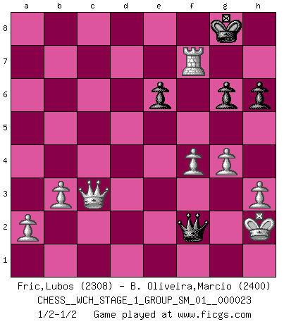 Last move : 1/2-1/2 2021 March 30 23:36:2 [Event "FICGS__CHESS__WCH_STAGE_1_GROUP_SM_01__000023"] [Site "FICGS"] [Date "2020.11.05"] [Round "1"] [White "Fric,Lubos"] [Black "B. Oliveira,Marcio"] [Result "1/2-1/2"] [WhiteElo "2308"] [BlackElo "2400"] 1.Nf3 Nf6 2.c4 c5 3.Nc3 e6 4.g3 b6 5.Bg2 Bb7 6.O-O Be7 7.d4 cxd4 8.Qxd4 d6 9.b3 O-O 10.Rd1 Nbd7 11.Bb2 a6 12.e4 Rc8 13.Qe3 Qc7 14.Nd4 Rfe8 15.h3 Bf8 16.Rac1 Qb8 17.Re1 Ba8 18.Rcd1 g6 19.Qd2 Red8 20.g4 h6 21.f4 b5 22.cxb5 axb5 23.Ndxb5 d5 24.e5 Ne4 25.Nxe4 dxe4 26.Nd6 Nc5 27.Re2 Kh7 28.Kh2 Bxd6 29.exd6 Nd3 30.Bxe4 Bxe4 31.Rxe4 Nxb2 32.Qxb2 Rxd6 33.Rxd6 Qxd6 34.Rd4 Qb6 35.Rd7 Rc3 36.Rxf7+ Kg8 37.Qxc3 Qf2+ 1/2-1/2 Reti Opening Kingside Castling by player White (move 6) Kingside Castling by player Black (move 9) This chess game ended in a draw. Follow this game move after move (download)When the Chess game is over, the Pawn and the King go back to the same box. (Irish saying) Frage: Was machen Sie mit den Preisen? Anwort: Ich habe Angst, dass meine Freundin davon neue Kleider kauft. (Loek van Wely) Bobby es el jugador de Ajedrez mas fino que este país jamás haya producido. Su memoria para las movidas, su brillantez en soñar combinaciones y su feróz determinación por la victoria son algo extraño. (John Collins) Mais n'est-ce pas déjà le limiter injurieusement que d'appeler les échecs un jeu? N'est-ce pas aussi une science, un art, ou quelque chose qui, comme le cercueil de Mahomet entre ciel et terre, est suspendu entre l'un et l'autre, et qui réunit un nombre incroyable de contraires ? (Stefan Zweig) They misunderestimated me. (George W. Bush, Bentonville nov. 6, 2000)
