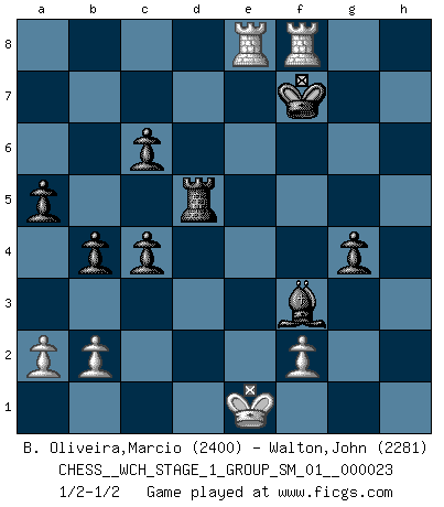 Last move : 1/2-1/2 2021 February 27 3:17:56 [Event "FICGS__CHESS__WCH_STAGE_1_GROUP_SM_01__000023"] [Site "FICGS"] [Date "2020.11.05"] [Round "1"] [White "B. Oliveira,Marcio"] [Black "Walton,John"] [Result "1/2-1/2"] [WhiteElo "2400"] [BlackElo "2281"] 1.d4 d5 2.c4 c6 3.Nf3 Nf6 4.Nc3 e6 5.Bg5 h6 6.Bh4 dxc4 7.e4 g5 8.Bg3 b5 9.Be2 Bb7 10.O-O Nbd7 11.Ne5 h5 12.Nxd7 Qxd7 13.Be5 Rh6 14.Qc1 Rg6 15.Rd1 Ng4 16.Bg3 f5 17.h3 f4 18.hxg4 hxg4 19.Bh2 Rh6 20.Bxg4 Qh7 21.Bh3 f3 22.d5 Be7 23.Rd2 fxg2 24.Bxg2 Rxh2 25.dxe6 Bc8 26.e5 Rxg2+ 27.Kxg2 b4 28.Nd1 Bxe6 29.Ne3 Qh3+ 30.Kg1 Kf7 31.Qf1 Qxf1+ 32.Kxf1 Rh8 33.Ke2 Rh4 34.Rad1 Bc5 35.Rg1 Kg6 36.Rd8 Re4 37.Rg3 Kf7 38.Rb8 Rxe5 39.Rb7+ Kf6 40.Rc7 Bd5 41.Kd2 Bxe3+ 42.Rxe3 Rf5 43.Ke1 a5 44.Ra7 Bf3 45.Ra8 Kg6 46.Rh8 g4 47.Rg8+ Kf7 48.R3e8 Rd5 49.Rgf8+ Kg7 50.Rg8+ Kf7 51.Rgf8+ 1/2-1/2 QGD Slav : 4.Nc3 Kingside Castling by player White (move 10) This chess game ended in a draw. Follow this game move after move (download)A man that will take back a move at Chess will pick a pocket. (Richard Fenton) Wenn ich Weiß habe gewinne ich weil ich Weiß habe, wenn ich Schwarz habe gewinne ich weil ich Bogoljubov bin. (Efim Bogoljubov) Si el ingenio solamente fuese necesario para lucirse, las mujeres serían las mejores jugadoras de Ajedrez del mundo. (Albin) Que feriez-vous si vous étiez en train de jouer aux échecs et que la fin du monde arrive ? Je continuerais à jouer. (Saint Borromée) Statistics can be made to prove anything - even the truth. (Author unknown)