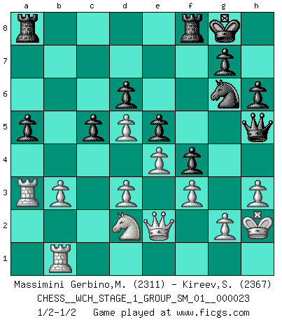 Last move : 1/2-1/2 2020 December 27 12:37:8 [Event "FICGS__CHESS__WCH_STAGE_1_GROUP_SM_01__000023"] [Site "FICGS"] [Date "2020.11.05"] [Round "1"] [White "Massimini Gerbino,Massimiliano"] [Black "Kireev,Sergey"] [Result "1/2-1/2"] [WhiteElo "2311"] [BlackElo "2367"] 1.e4 e5 2.Nf3 Nc6 3.Bc4 Bc5 4.c3 Nf6 5.d3 d6 6.Nbd2 a6 7.Bb3 O-O 8.O-O Ba7 9.h3 h6 10.Re1 Be6 11.Nf1 Re8 12.Be3 Bxe3 13.Nxe3 Qd7 14.Bxe6 Qxe6 15.c4 Ne7 16.Qc2 Ng6 17.Kh2 c6 18.Nf5 b5 19.b3 c5 20.Reb1 Reb8 21.Ne3 a5 22.Ng1 Ne7 23.Ne2 b4 24.Nd5 Nfxd5 25.cxd5 Qf6 26.Ng3 Qg5 27.Nf1 Rf8 28.Qd2 Qh4 29.a3 f5 30.f3 f4 31.Qe2 Ng6 32.Nd2 bxa3 33.Rxa3 Qh5 1/2-1/2 Giuoco Piano Kingside Castling by player Black (move 7) Kingside Castling by player White (move 8) This chess game ended in a draw. Follow this game move after move (download)When you see a good move, look for a better one. (Emanuel Lasker) Du musst Deinen Gegner in einen tiefen dunklen Wald führen wo 2+2=5 ist und wo der Weg, der wieder hinausführt, nur breit genug für einen ist. (Mikhail Nekhemyevich Tal) El Ajedrez es como la guerra en un tablero. (Bobby Fischer) La vie et les Echecs sont tous les deux une lutte constante. (Lasker) I think your argument is specious - I think your tie is ugly. (Gregory House to Dr. Foreman, House M.D.)